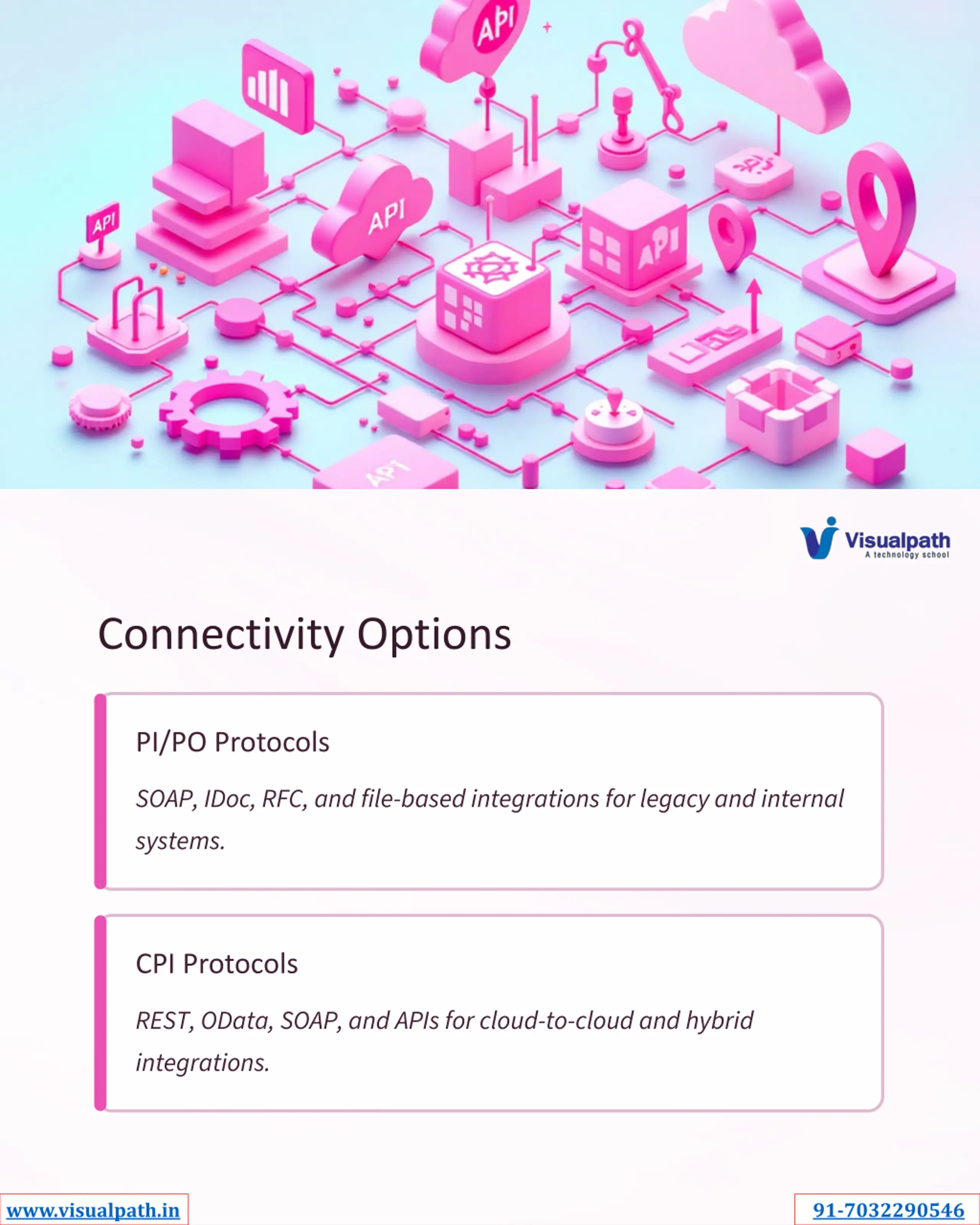 Connectivity Options PI/PO Protocols SOAP, IDoc, RFC, and file-based integrations for legacy and internal systems. CPI Protocols REST, OData, SOAP, and APIs for cloud-to-cloud and hybrid integrations. preencoded.png www.visualpath.in +91-7032290546