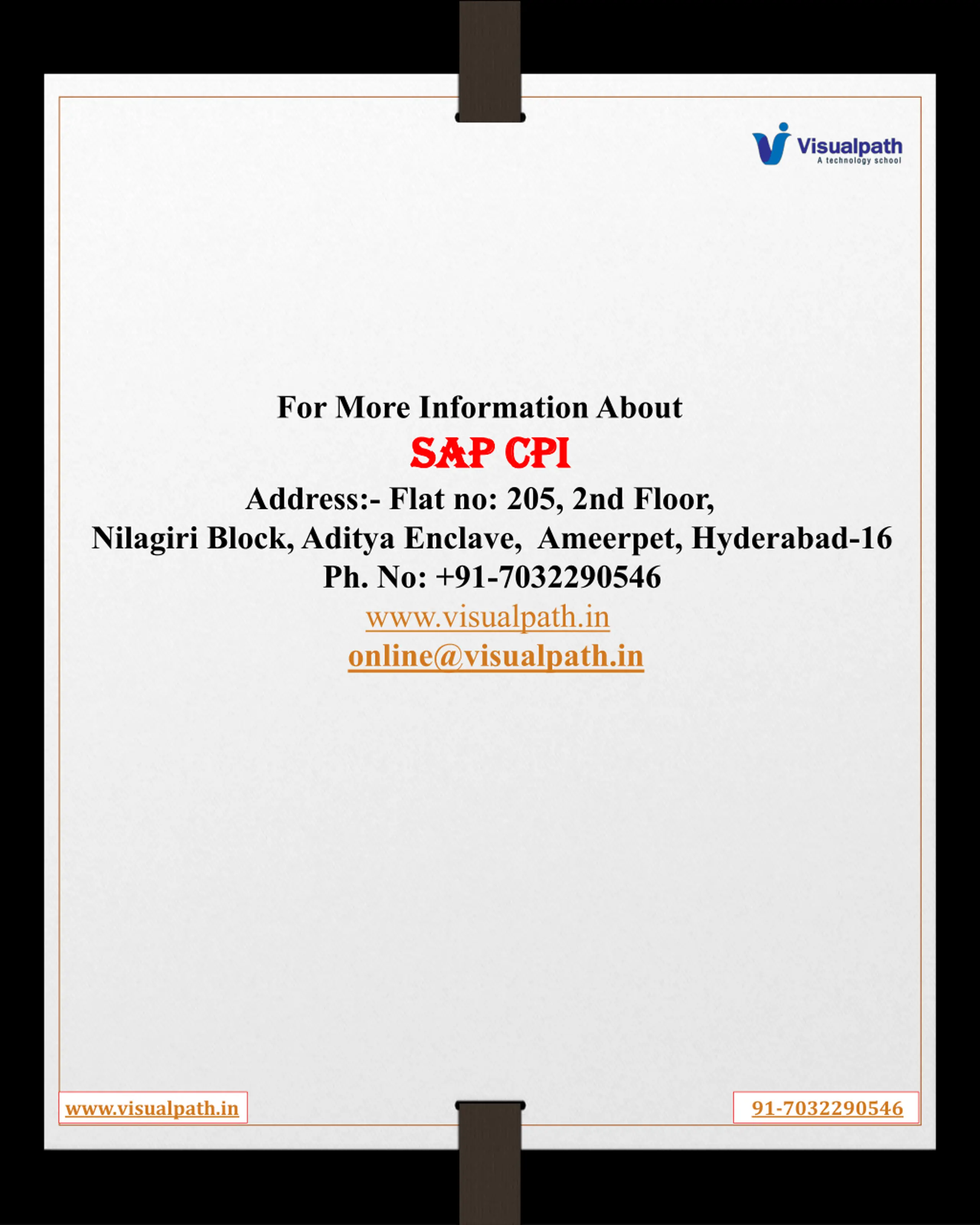 For More Information About sap sap cpi Address:- Flat no: 205, 2nd Floor, Nilagiri Block, Aditya Enclave, Ameerpet, Hyderabad-16 Ph. No: +91-7032290546 www.visualpath.in online@visualpath.in cpi www.visualpath.in +91-7032290546