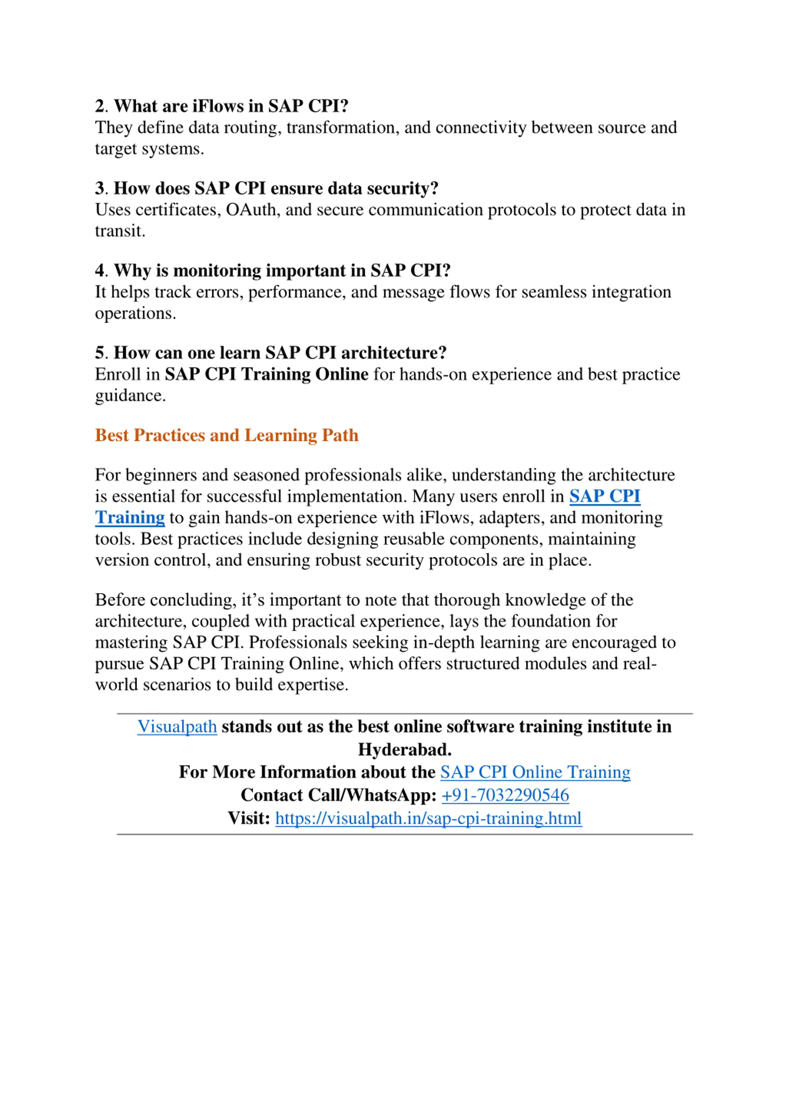 2. What are iFlows in SAP CPI? They define data routing, transformation, and connectivity between source and target systems. 3. How does SAP CPI ensure data security? Uses certificates, OAuth, and secure communication protocols to protect data in transit. 4. Why is monitoring important in SAP CPI? It helps track errors, performance, and message flows for seamless integration operations. 5. How can one learn SAP CPI architecture? Enroll in SAP CPI Training Online for hands-on experience and best practice guidance. Best Practices and Learning Path For beginners and seasoned professionals alike, understanding the architecture is essential for successful implementation. Many users enroll in SAP CPI Training to gain hands-on experience with iFlows, adapters, and monitoring tools. Best practices include designing reusable components, maintaining version control, and ensuring robust security protocols are in place. Before concluding, it s important to note that thorough knowledge of the architecture, coupled with practical experience, lays the foundation for mastering SAP CPI. Professionals seeking in-depth learning are encouraged to pursue SAP CPI Training Online, which offers structured modules and real- world scenarios to build expertise. Visualpath stands out as the best online software training institute in Hyderabad. For More Information aboutthe SAP CPI Online Training Contact Call/WhatsApp: +91-7032290546 Visit: https://visualpath.in/sap-cpi-training.html