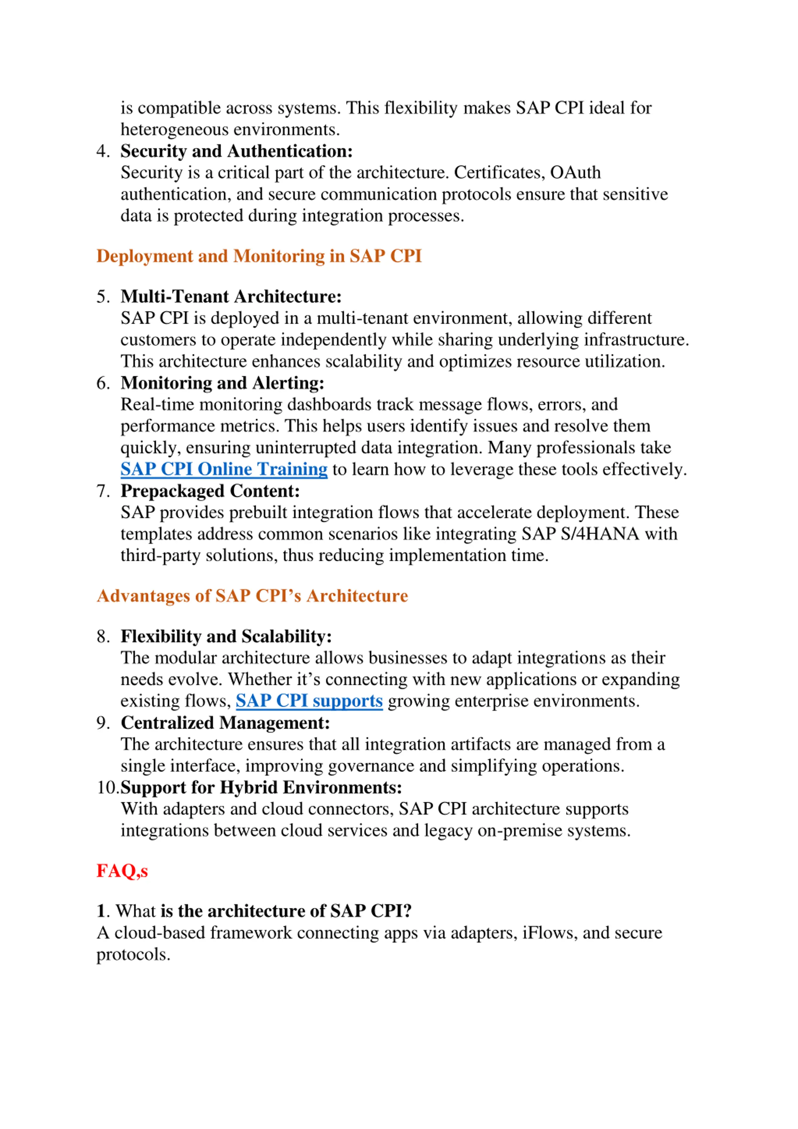 is compatible across systems. This flexibility makes SAP CPI ideal for heterogeneous environments. 4.Security and Authentication: Security is a critical part of the architecture. Certificates, OAuth authentication, and secure communication protocols ensure that sensitive data is protected during integration processes. Deployment and Monitoring in SAP CPI 5.Multi-Tenant Architecture: SAP CPI is deployed in a multi-tenant environment, allowing different customers to operate independently while sharing underlying infrastructure. This architecture enhances scalability and optimizes resource utilization. 6.Monitoring and Alerting: Real-time monitoring dashboards track message flows, errors, and performance metrics. This helps users identify issues and resolve them quickly, ensuring uninterrupted data integration. Many professionals take SAP CPI Online Training to learn how to leverage these tools effectively. 7.Prepackaged Content: SAP provides prebuilt integration flows that accelerate deployment. These templates address common scenarios like integrating SAP S/4HANA with third-party solutions, thus reducing implementation time. Advantages of SAP CPI s Architecture 8.Flexibility and Scalability: The modular architecture allows businesses to adapt integrations as their needs evolve. Whether it s connecting with new applications or expanding existing flows, SAP CPI supports growing enterprise environments. 9.Centralized Management: The architecture ensures that all integration artifacts are managed from a single interface, improving governance and simplifying operations. 10.Support for Hybrid Environments: With adapters and cloud connectors, SAP CPI architecture supports integrations between cloud services and legacy on-premise systems. FAQ,s 1. What is the architecture of SAP CPI? A cloud-based framework connecting apps via adapters, iFlows, and secure protocols.