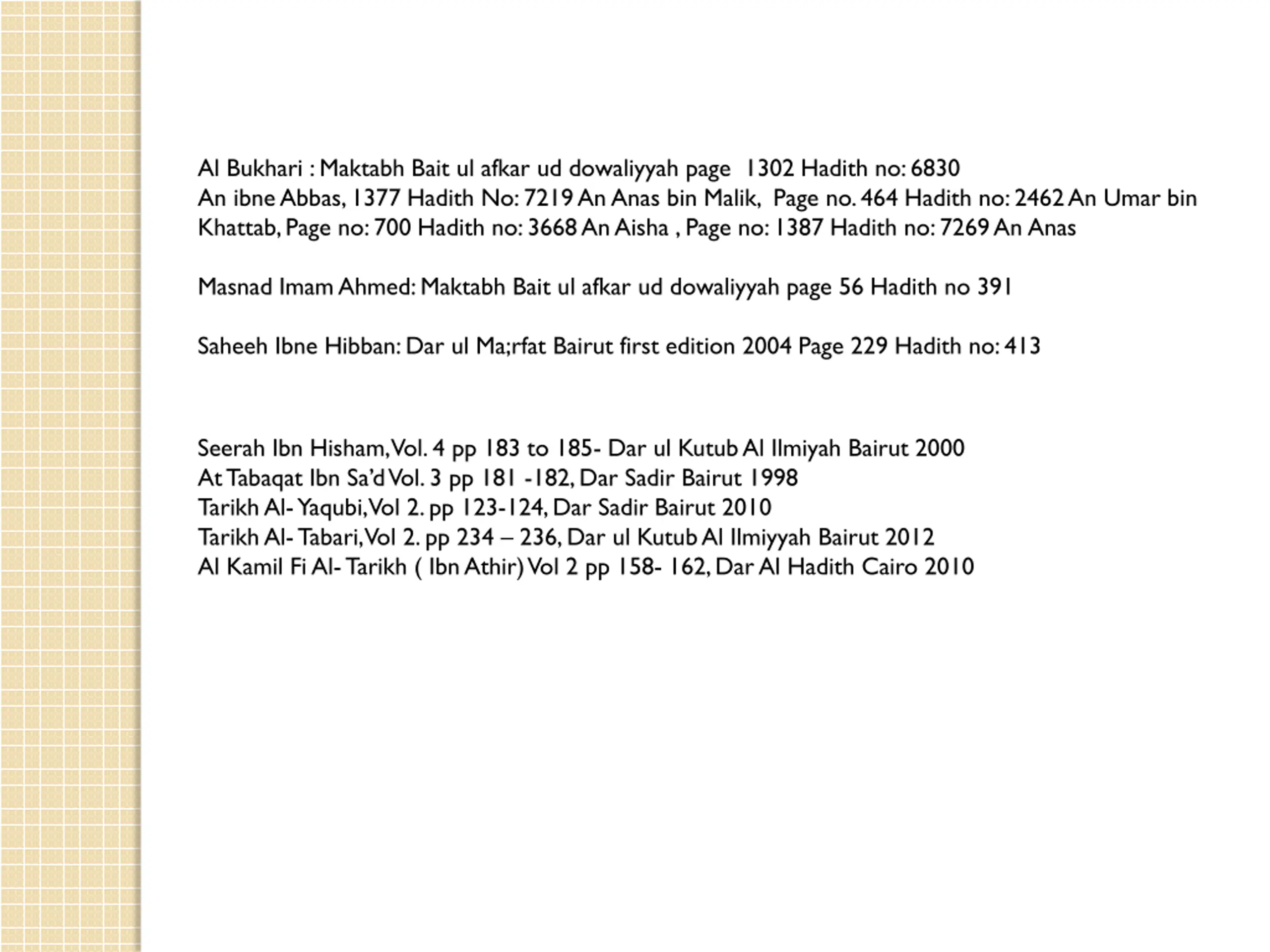 Al Bukhari : Maktabh Bait ul afkar ud dowaliyyah page 1302 Hadith no: 6830 An ibne Abbas, 1377 Hadith No: 7219 An Anas bin Malik, Page no. 464 Hadith no: 2462 An Umar bin Khattab, Page no: 700 Hadith no: 3668 An Aisha , Page no: 1387 Hadith no: 7269 An Anas Masnad Imam Ahmed: Maktabh Bait ul afkar ud dowaliyyah page 56 Hadith no 391 Saheeh Ibne Hibban: Dar ul Ma;rfat Bairut first edition 2004 Page 229 Hadith no: 413 Seerah Ibn Hisham, Vol. 4 pp 183 to 185- Dar ul Kutub Al Ilmiyah Bairut 2000 At Tabaqat Ibn Sa d Vol. 3 pp 181 -182, Dar Sadir Bairut 1998 Tarikh Al- Yaqubi, Vol 2. pp 123-124, Dar Sadir Bairut 2010 Tarikh Al- Tabari, Vol 2. pp 234 236, Dar ul Kutub Al Ilmiyyah Bairut 2012 Al Kamil Fi Al- Tarikh ( Ibn Athir) Vol 2 pp 158- 162, Dar Al Hadith Cairo 2010