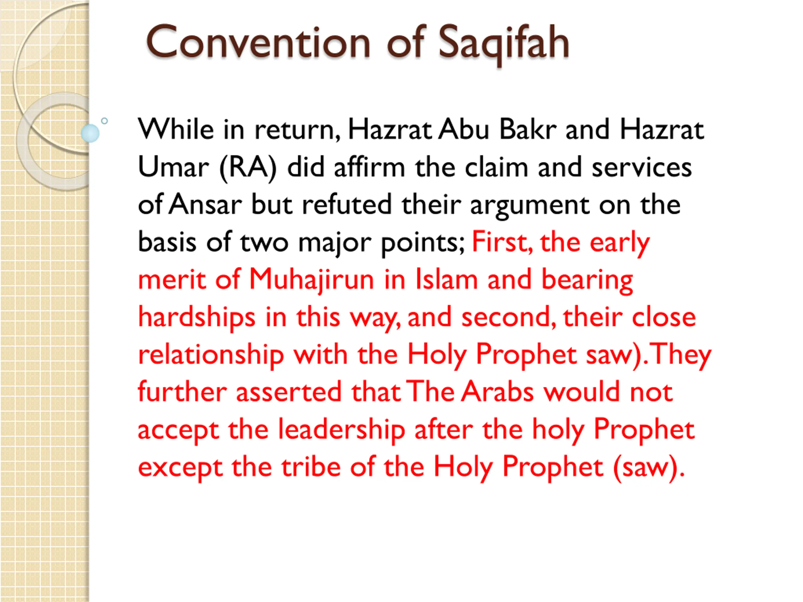 Convention of Saqifah While in return, Hazrat Abu Bakr and Hazrat Umar (RA) did affirm the claim and services of Ansar but refuted their argument on the basis of two major points; First, the early merit of Muhajirun in Islam and bearing hardships in this way, and second, their close relationship with the Holy Prophet saw).They further asserted that The Arabs would not accept the leadership after the holy Prophet except the tribe of the Holy Prophet (saw).