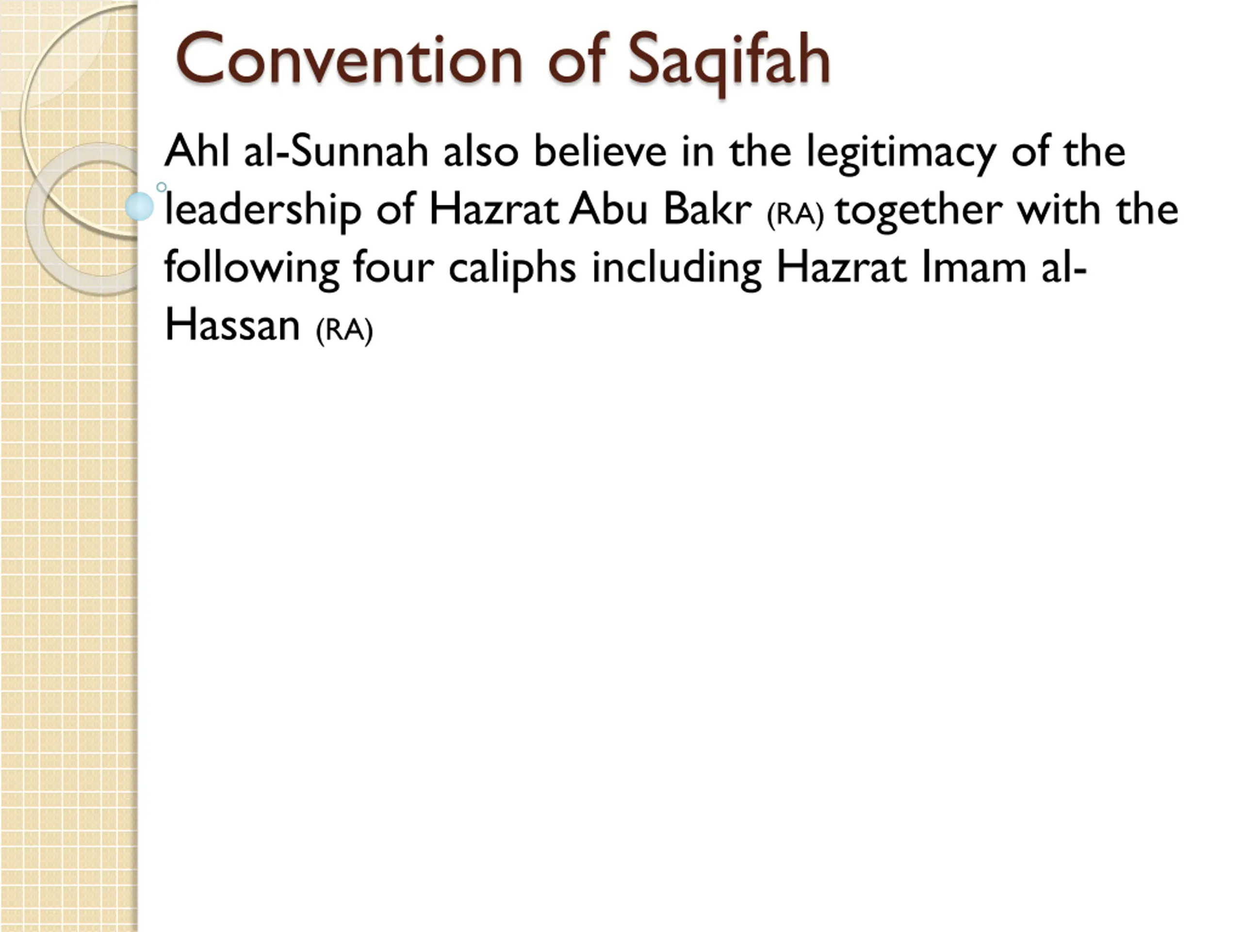 Convention of Saqifah Ahl al-Sunnah also believe in the legitimacy of the leadership of Hazrat Abu Bakr (RA) together with the following four caliphs including Hazrat Imam al- Hassan (RA)