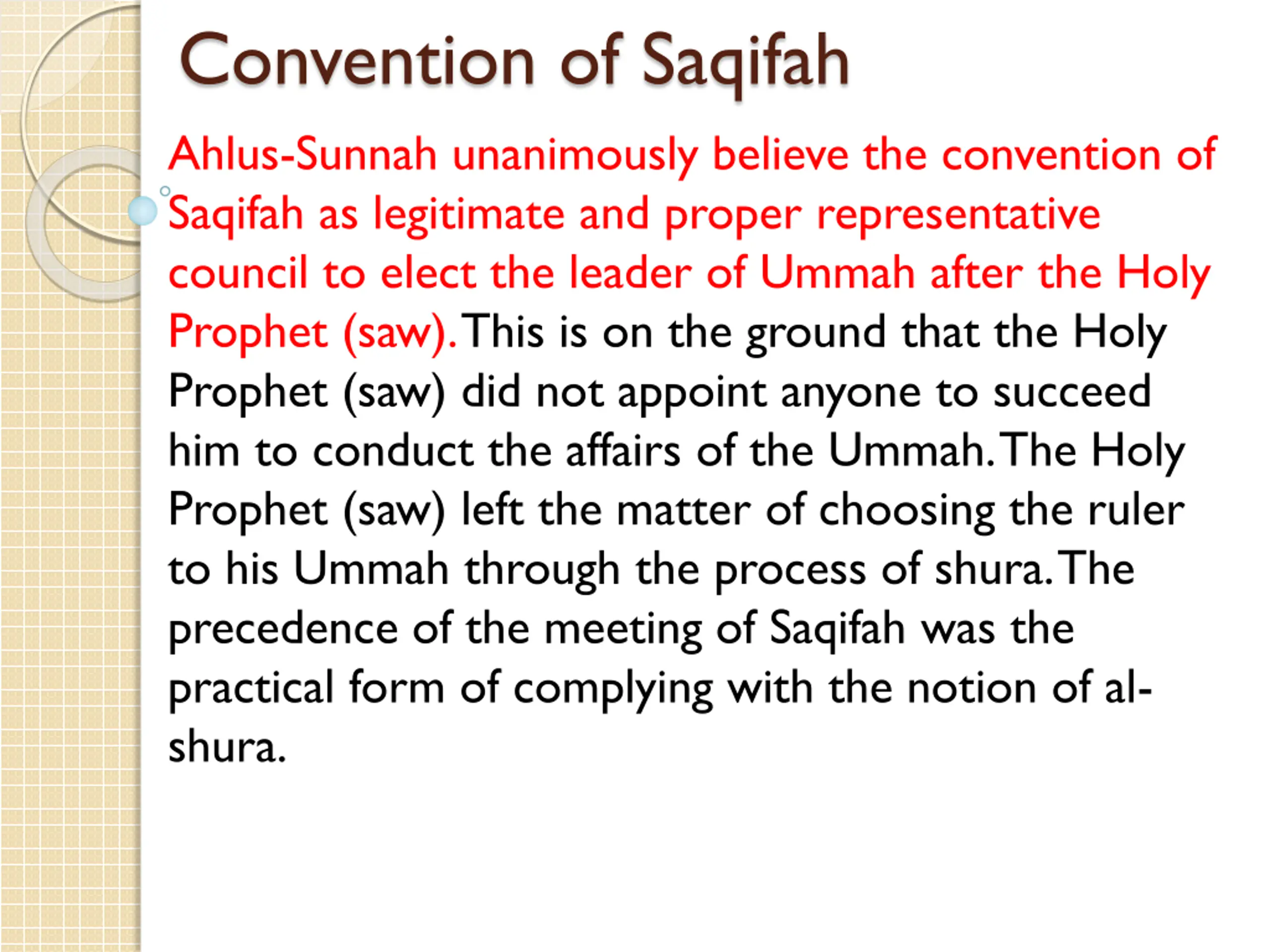 Convention of Saqifah Ahlus-Sunnah unanimously believe the convention of Saqifah as legitimate and proper representative council to elect the leader of Ummah after the Holy Prophet (saw). This is on the ground that the Holy Prophet (saw) did not appoint anyone to succeed him to conduct the affairs of the Ummah. The Holy Prophet (saw) left the matter of choosing the ruler to his Ummah through the process of shura. The precedence of the meeting of Saqifah was the practical form of complying with the notion of al- shura.