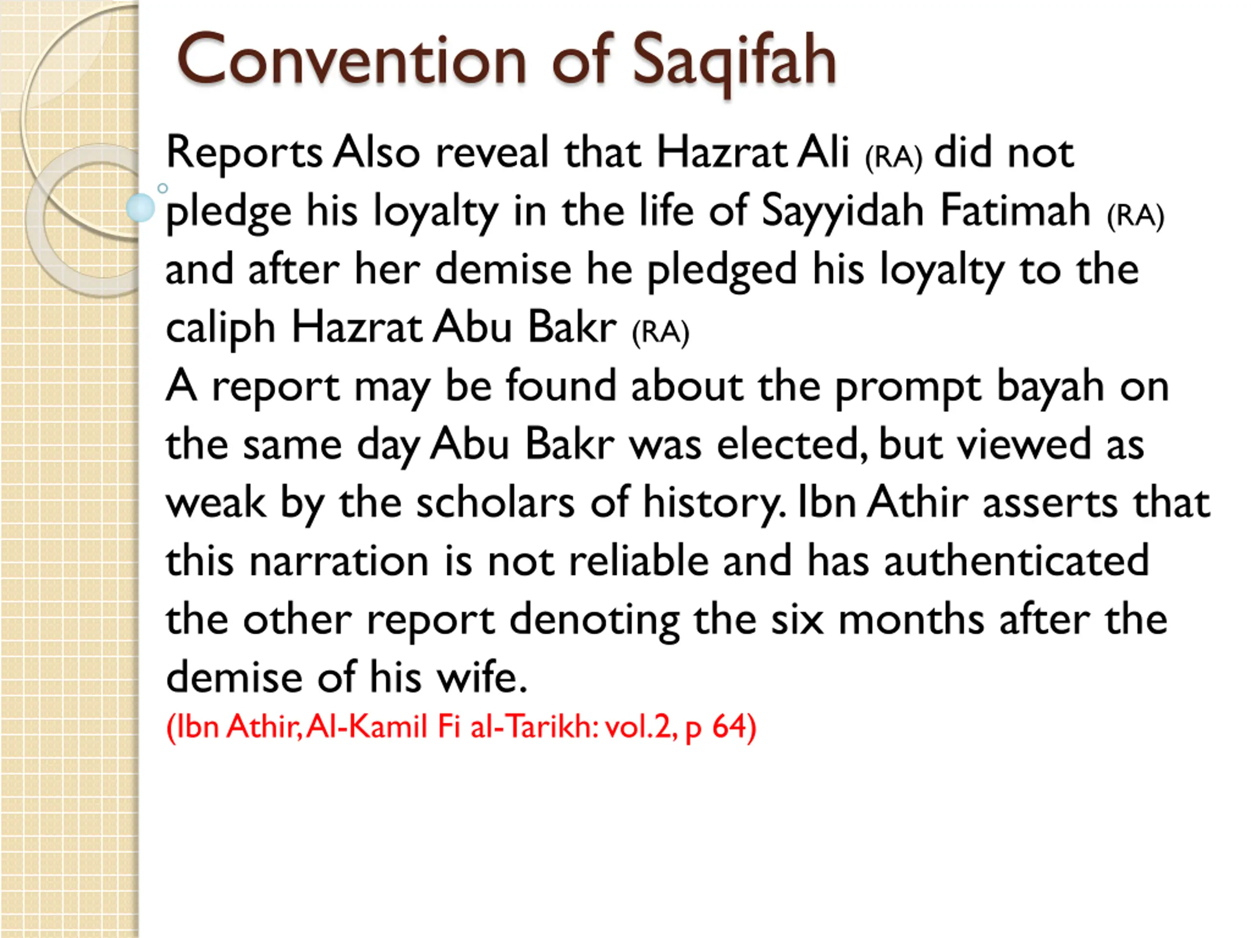 Convention of Saqifah Reports Also reveal that Hazrat Ali (RA) did not pledge his loyalty in the life of Sayyidah Fatimah (RA) and after her demise he pledged his loyalty to the caliph Hazrat Abu Bakr (RA) A report may be found about the prompt bayah on the same day Abu Bakr was elected, but viewed as weak by the scholars of history. Ibn Athir asserts that this narration is not reliable and has authenticated the other report denoting the six months after the demise of his wife. (Ibn Athir, Al-Kamil Fi al-Tarikh: vol.2, p 64)