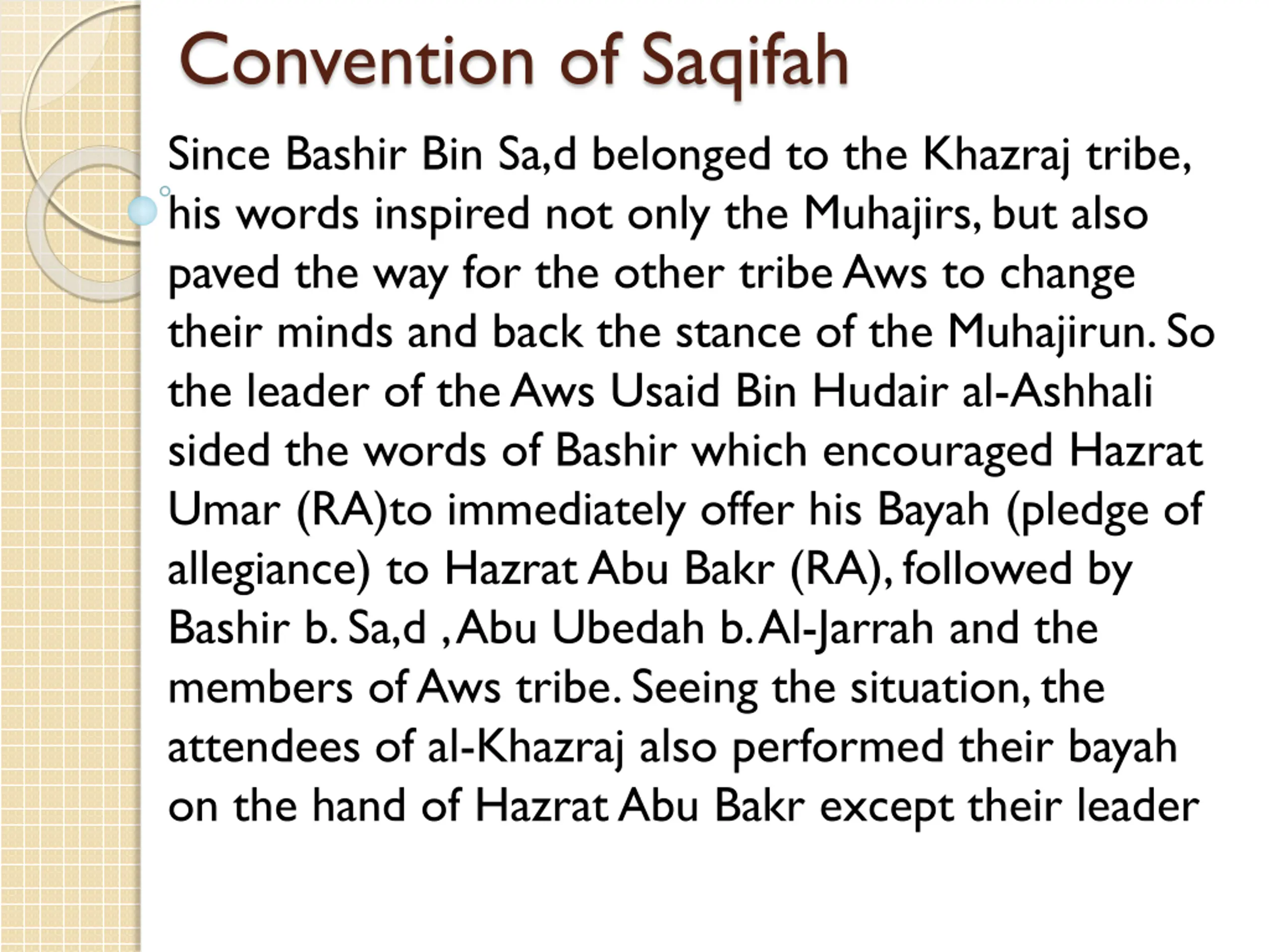 Convention of Saqifah Since Bashir Bin Sa,d belonged to the Khazraj tribe, his words inspired not only the Muhajirs, but also paved the way for the other tribe Aws to change their minds and back the stance of the Muhajirun. So the leader of the Aws Usaid Bin Hudair al-Ashhali sided the words of Bashir which encouraged Hazrat Umar (RA)to immediately offer his Bayah (pledge of allegiance) to Hazrat Abu Bakr (RA), followed by Bashir b. Sa,d , Abu Ubedah b. Al-Jarrah and the members of Aws tribe. Seeing the situation, the attendees of al-Khazraj also performed their bayah on the hand of Hazrat Abu Bakr except their leader