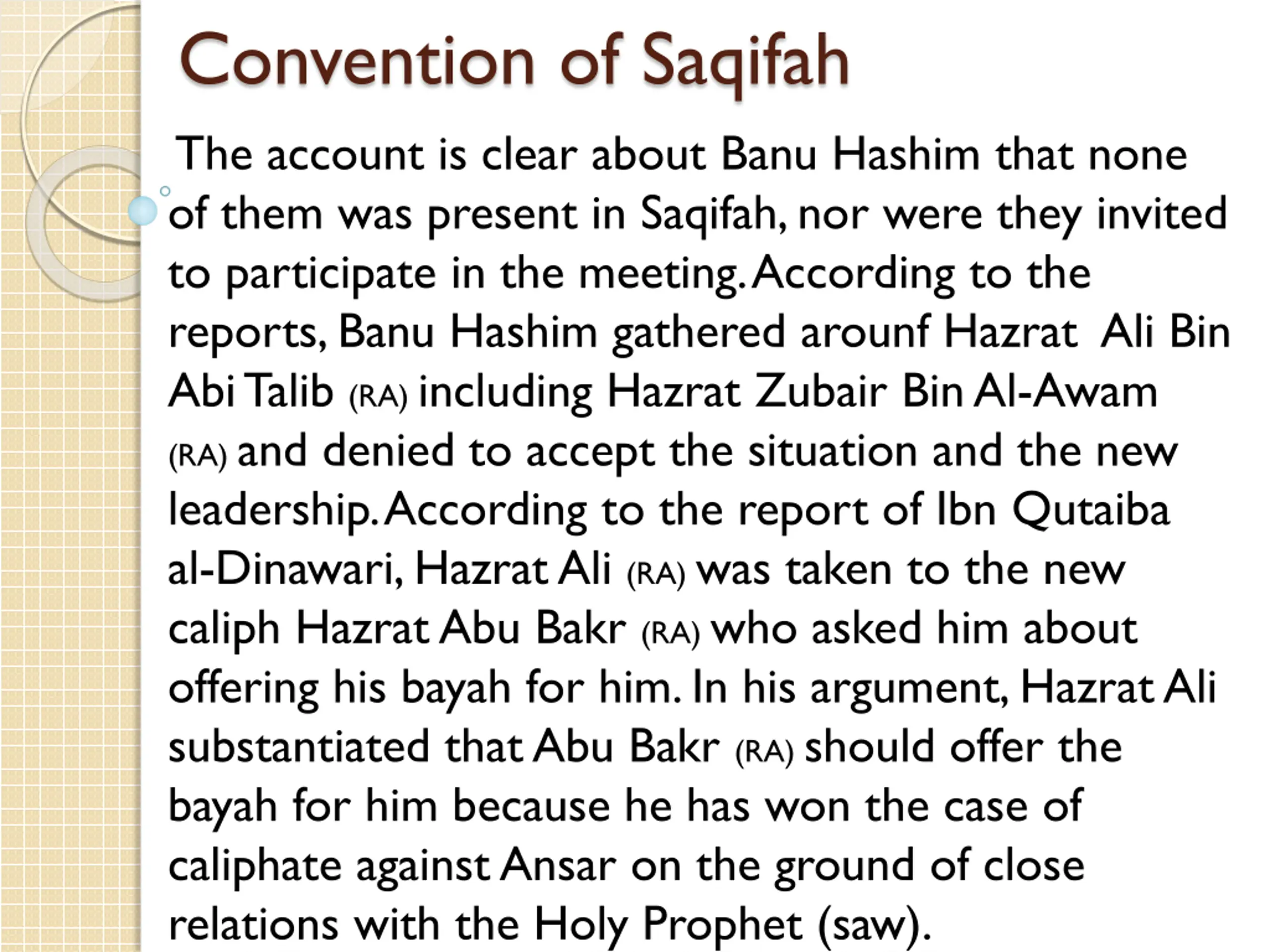Convention of Saqifah The account is clear about Banu Hashim that none of them was present in Saqifah, nor were they invited to participate in the meeting. According to the reports, Banu Hashim gathered arounf Hazrat Ali Bin Abi Talib (RA) including Hazrat Zubair Bin Al-Awam (RA) and denied to accept the situation and the new leadership. According to the report of Ibn Qutaiba al-Dinawari, Hazrat Ali (RA) was taken to the new caliph Hazrat Abu Bakr (RA) who asked him about offering his bayah for him. In his argument, Hazrat Ali substantiated that Abu Bakr (RA) should offer the bayah for him because he has won the case of caliphate against Ansar on the ground of close relations with the Holy Prophet (saw).