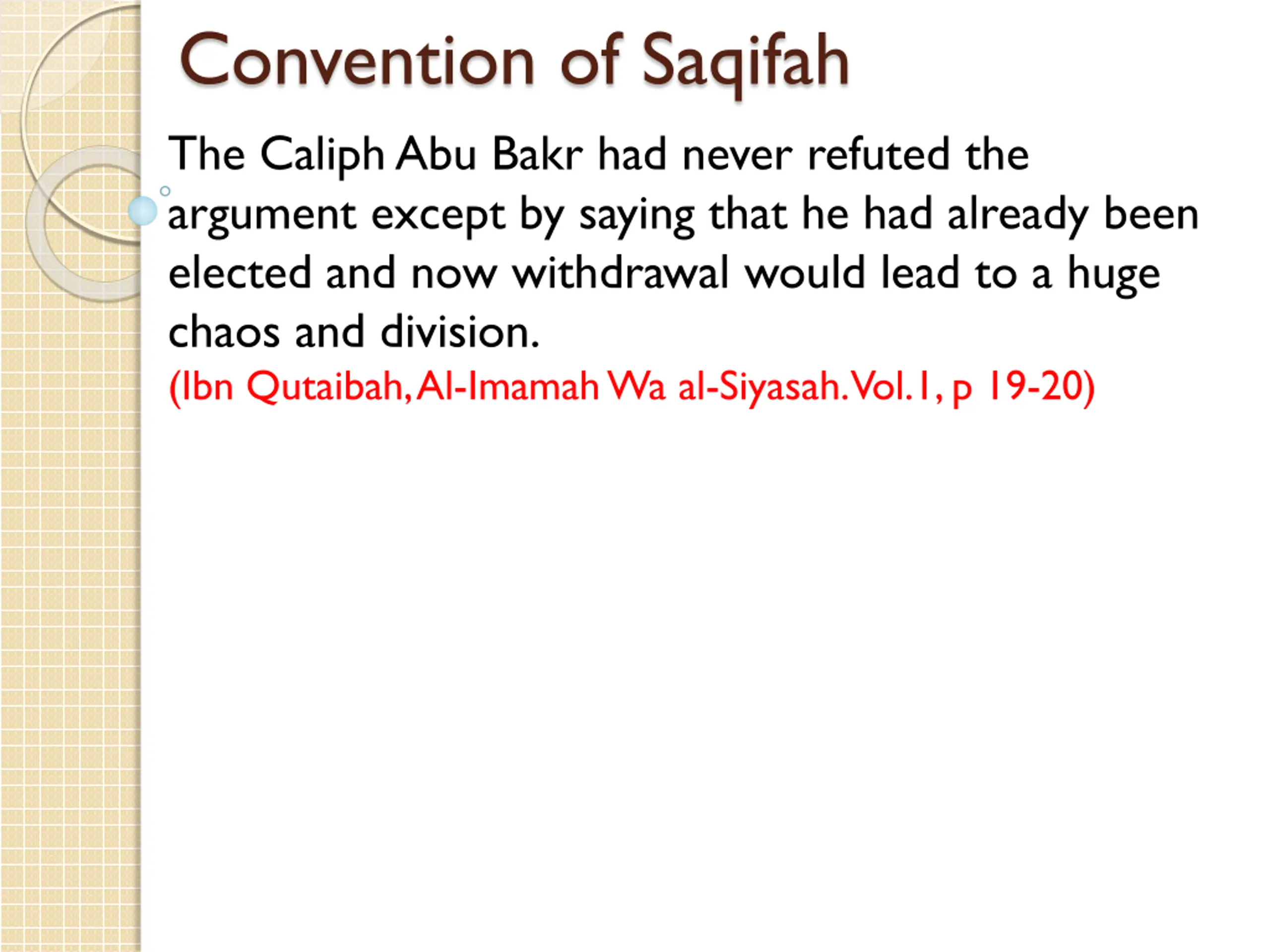 Convention of Saqifah The Caliph Abu Bakr had never refuted the argument except by saying that he had already been elected and now withdrawal would lead to a huge chaos and division. (Ibn Qutaibah, Al-Imamah Wa al-Siyasah. Vol.1, p 19-20)