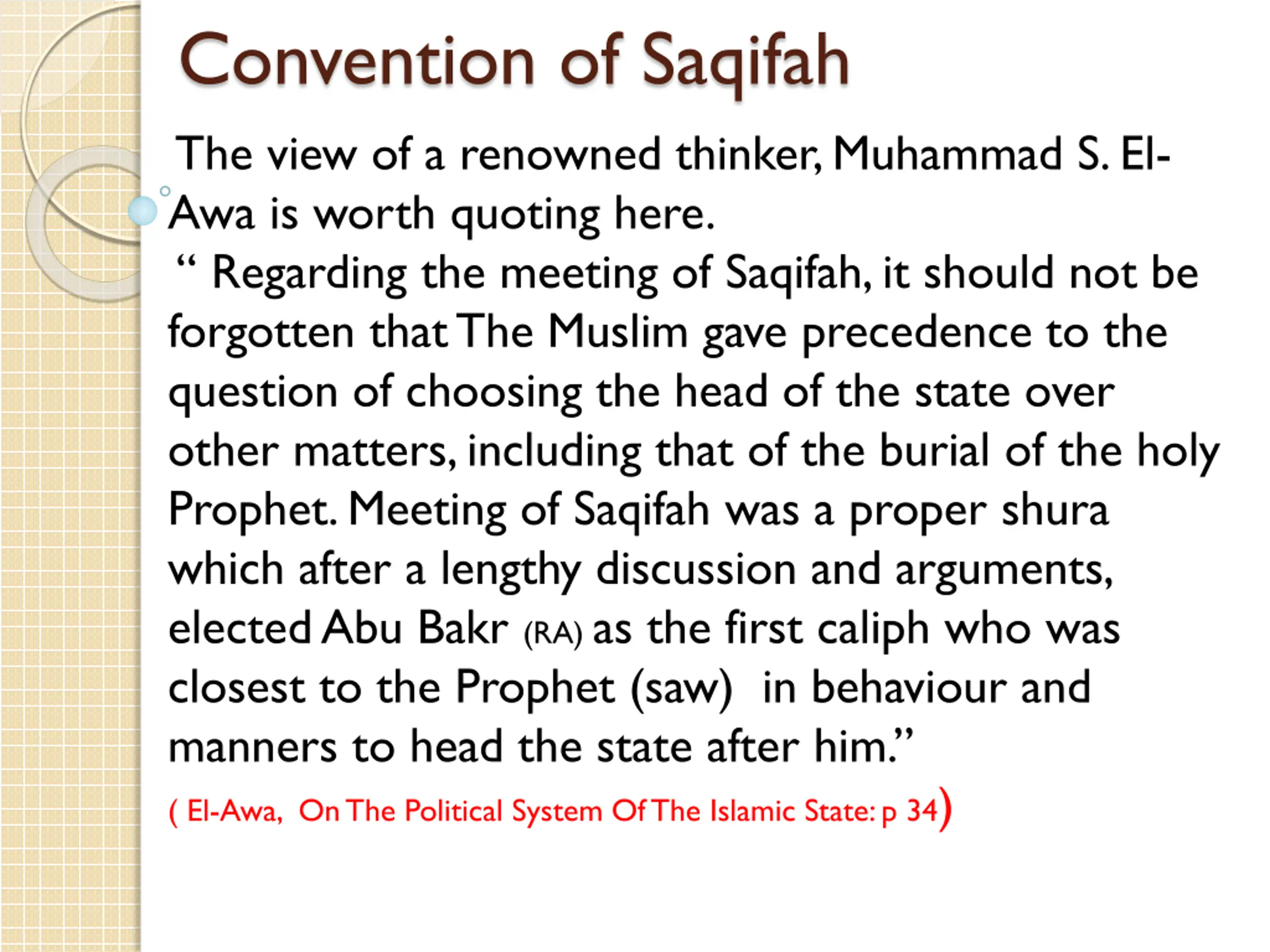 Convention of Saqifah The view of a renowned thinker, Muhammad S. El- Awa is worth quoting here. Regarding the meeting of Saqifah, it should not be forgotten that The Muslim gave precedence to the question of choosing the head of the state over other matters, including that of the burial of the holy Prophet. Meeting of Saqifah was a proper shura which after a lengthy discussion and arguments, elected Abu Bakr (RA) as the first caliph who was closest to the Prophet (saw) in behaviour and manners to head the state after him. ( El-Awa, On The Political System Of The Islamic State: p 34)
