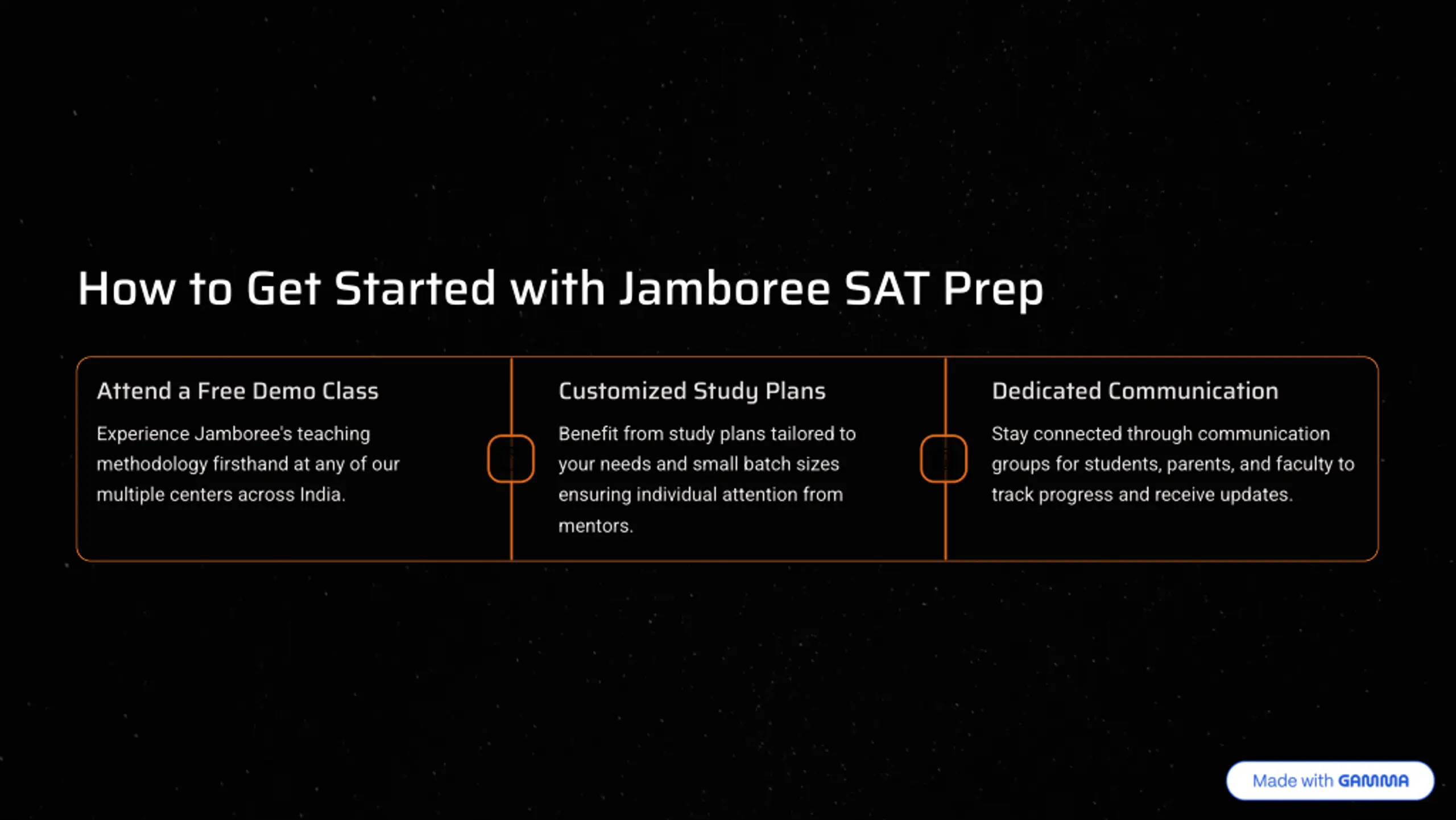 How to Get Started with Jamboree SAT Prep Attend a Free Demo Class Customized Study Plans Dedicated Communication Experience Jamboree's teaching methodology firsthand at any of our multiple centers across India. Benefit from study plans tailored to your needs and small batch sizes ensuring individual attention from mentors. Stay connected through communication groups for students, parents, and faculty to track progress and receive updates.