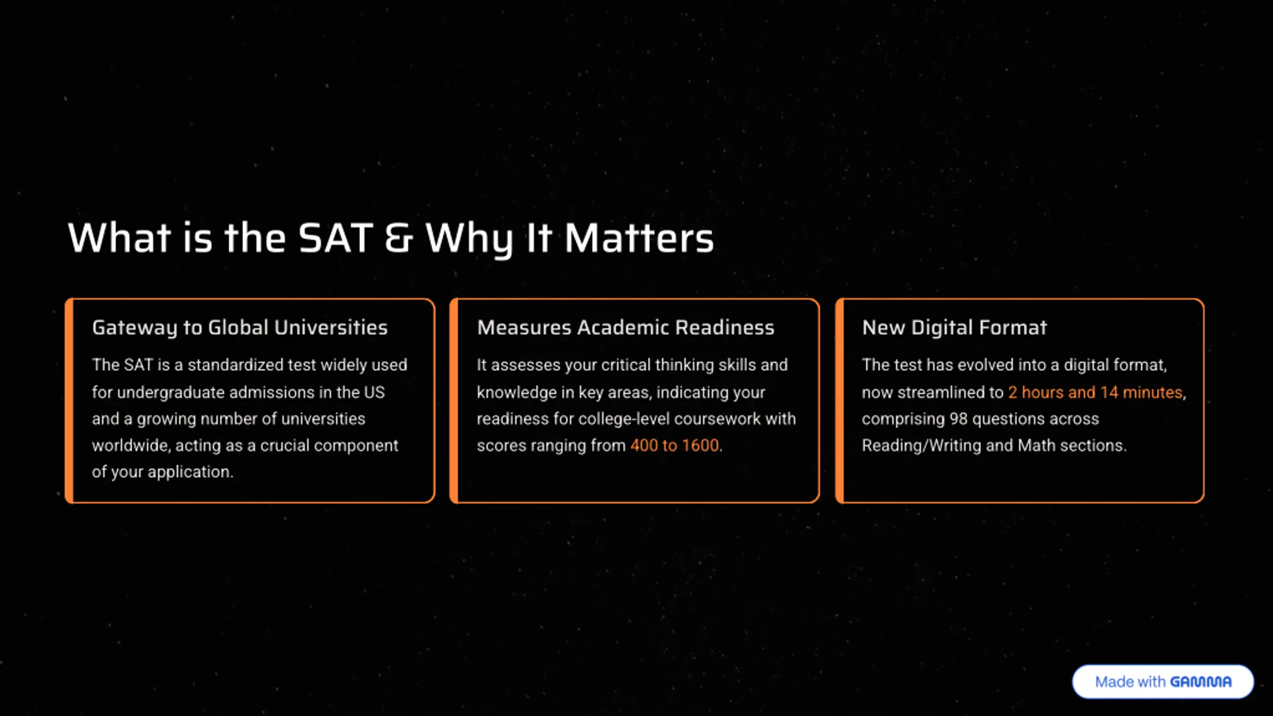 What is the SAT & Why It Matters Gateway to Global Universities Measures Academic Readiness New Digital Format The SAT is a standardized test widely used for undergraduate admissions in the US and a growing number of universities worldwide, acting as a crucial component of your application. It assesses your critical thinking skills and knowledge in key areas, indicating your readiness for college-level coursework with scores ranging from 400 to 1600. The test has evolved into a digital format, now streamlined to 2 hours and 14 minutes, comprising 98 questions across Reading/Writing and Math sections.