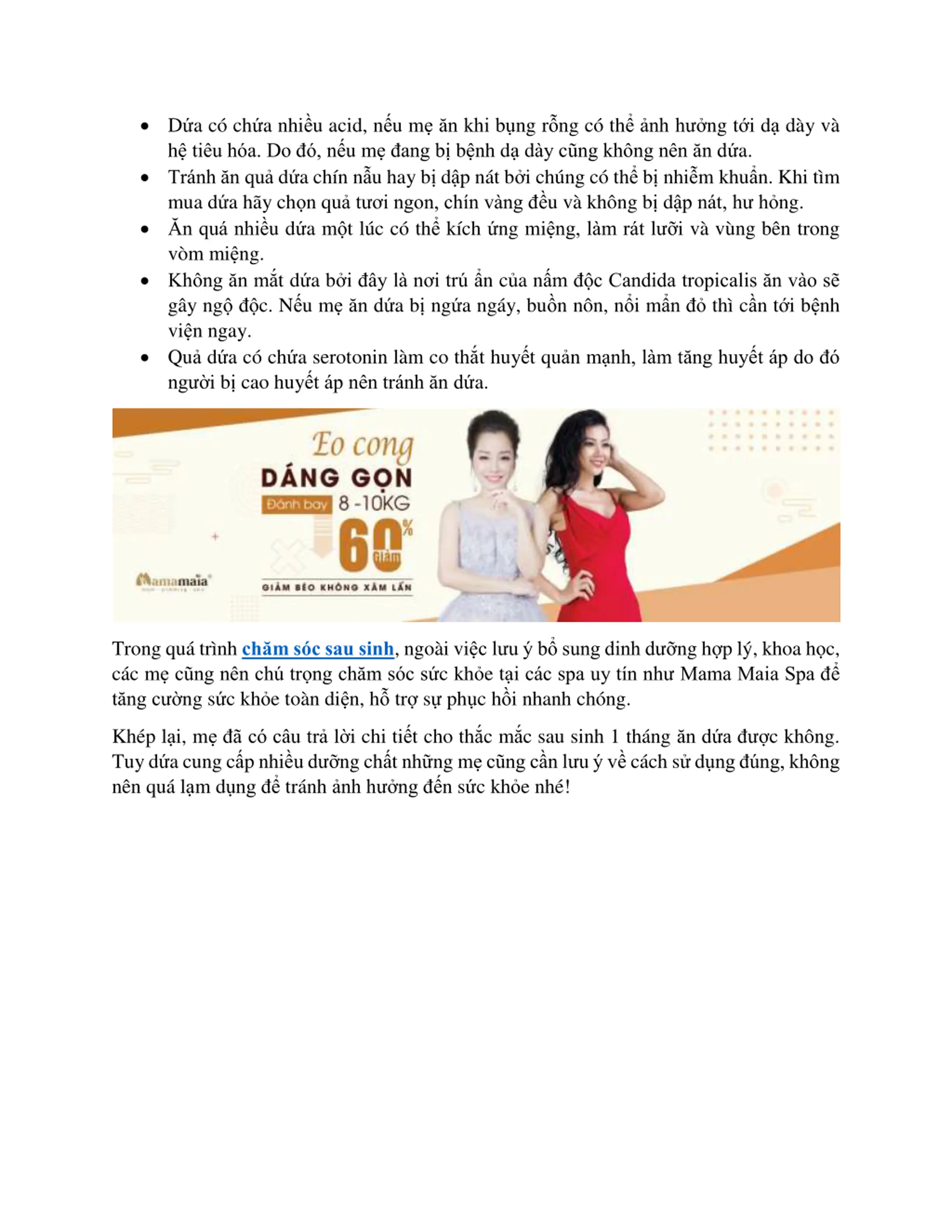 Da c cha nhiu acid, nu mn khi bng rng c thnh hng ti d dy v h ti u h a. Do , n u m ang b b nh d d y c ng kh ng n n n d a. Tr nh n qu d a ch n n u hay b d p n t b i ch ng c th b nhi m khu n. Khi t m mua d a h y ch n qu t i ngon, ch n v ng u v kh ng b d p n t, h h ng. n qu nhi u d a m t l c c th k ch ng mi ng, l m r t l i v v ng b n trong v m mi ng. Kh ng n m t d a b i y l n i tr n c a n m c Candida tropicalis n v o s g y ng c. N u m n d a b ng a ng y, bu n n n, n i m n th c n t i b nh vi n ngay. Qu d a c ch a serotonin l m co th t huy t qu n m nh, l m t ng huy t p do ng i b cao huy t p n n tr nh n d a. Trong qu tr nh ch m s c sau sinh, ngo i vi c l u b sung dinh d ng h p l , khoa h c, c c m c ng n n ch tr ng ch m s c s c kh e t i c c spa uy t n nh Mama Maia Spa t ng c ng s c kh e to n di n, h tr s ph c h i nhanh ch ng. Kh p l i, m c c u tr l i chi ti t cho th c m c sau sinh 1 th ng n d a c kh ng. Tuy d a cung c p nhi u d ng ch t nh ng m c ng c n l u v c ch s d ng ng, kh ng n n qu l m d ng tr nh nh h ng n s c kh e nh !