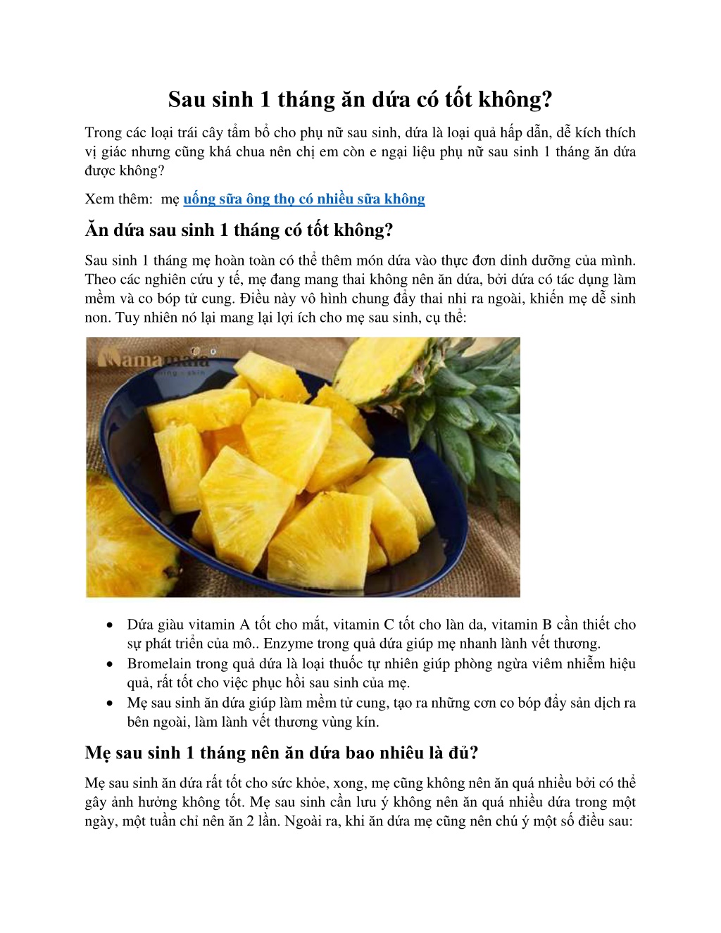 Sau sinh 1 thng n da c tt khng? Trong c c lo i tr i c y t m b cho ph n sau sinh, d a l lo i qu h p d n, d k ch th ch v gi c nh ng c ng kh chua n n ch em c n e ng i li u ph n sau sinh 1 th ng n d a c kh ng? Xem th m: m u ng s a ng th c nhi u s a kh ng n d a sau sinh 1 th ng c t t kh ng? Sau sinh 1 th ng m ho n to n c th th m m n d a v o th c n dinh d ng c a m nh. Theo c c nghi n c u y t , m ang mang thai kh ng n n n d a, b i d a c t c d ng l m m m v co b p t cung. i u n y v h nh chung y thai nhi ra ngo i, khi n m d sinh non. Tuy nhi n n l i mang l i l i ch cho m sau sinh, c th : D a gi u vitamin A t t cho m t, vitamin C t t cho l n da, vitamin B c n thi t cho s ph t tri n c a m .. Enzyme trong qu d a gi p m nhanh l nh v t th ng. Bromelain trong qu d a l lo i thu c t nhi n gi p ph ng ng a vi m nhi m hi u qu , r t t t cho vi c ph c h i sau sinh c a m . M sau sinh n d a gi p l m m m t cung, t o ra nh ng c n co b p y s n d ch ra b n ngo i, l m l nh v t th ng v ng k n. M sau sinh 1 th ng n n n d a bao nhi u l ? M sau sinh n d a r t t t cho s c kh e, xong, m c ng kh ng n n n qu nhi u b i c th g y nh h ng kh ng t t. M sau sinh c n l u kh ng n n n qu nhi u d a trong m t ng y, m t tu n ch n n n 2 l n. Ngo i ra, khi n d a m c ng n n ch m t s i u sau: