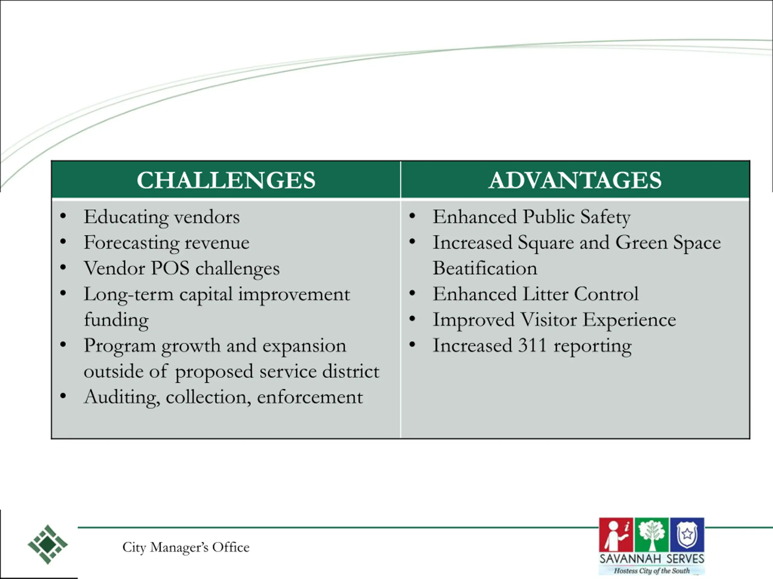 CHALLENGES Educating vendors Forecasting revenue Vendor POS challenges Long-term capital improvement funding Program growth and expansion outside of proposed service district Auditing, collection, enforcement ADVANTAGES Enhanced Public Safety Increased Square and Green Space Beatification Enhanced Litter Control Improved Visitor Experience Increased 311 reporting City Manager s Office