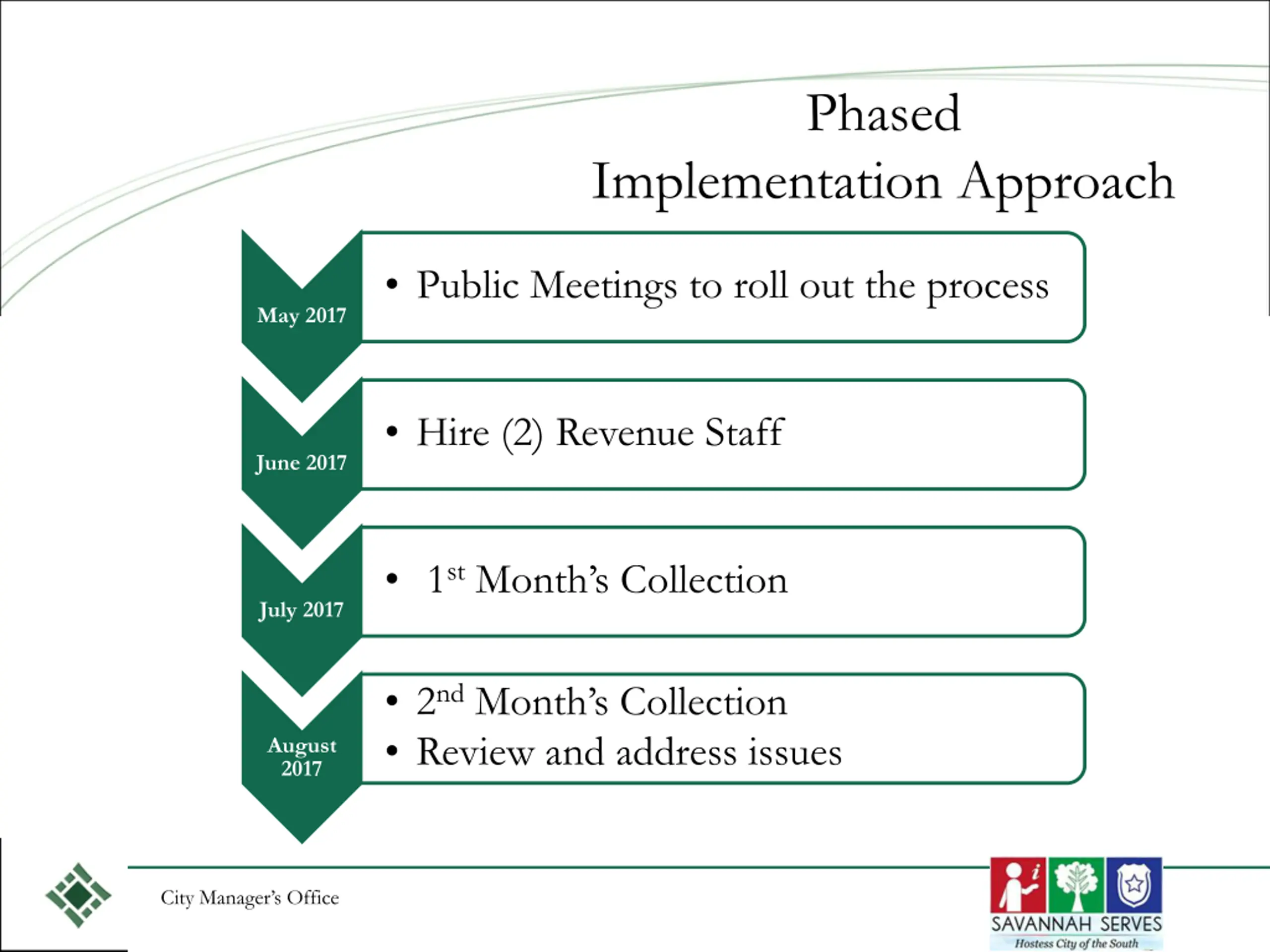 Phased Implementation Approach Public Meetings to roll out the process May 2017 Hire (2) Revenue Staff June 2017 1stMonth s Collection July 2017 2ndMonth s Collection Review and address issues August 2017 City Manager s Office