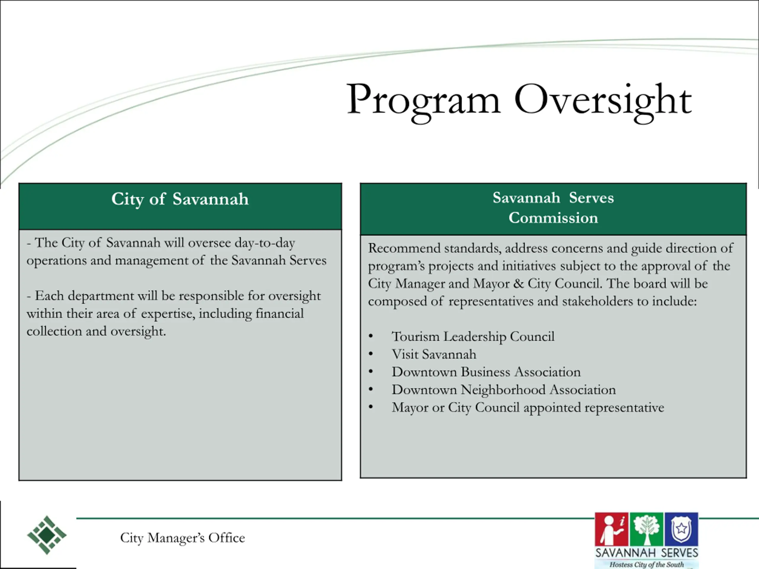 Program Oversight Savannah Serves Commission City of Savannah - The City of Savannah will oversee day-to-day operations and management of the Savannah Serves Recommend standards, address concerns and guide direction of program s projects and initiatives subject to the approval of the City Manager and Mayor & City Council. The board will be composed of representatives and stakeholders to include: - Each department will be responsible for oversight within their area of expertise, including financial collection and oversight. Tourism Leadership Council Visit Savannah Downtown Business Association Downtown Neighborhood Association Mayor or City Council appointed representative City Manager s Office
