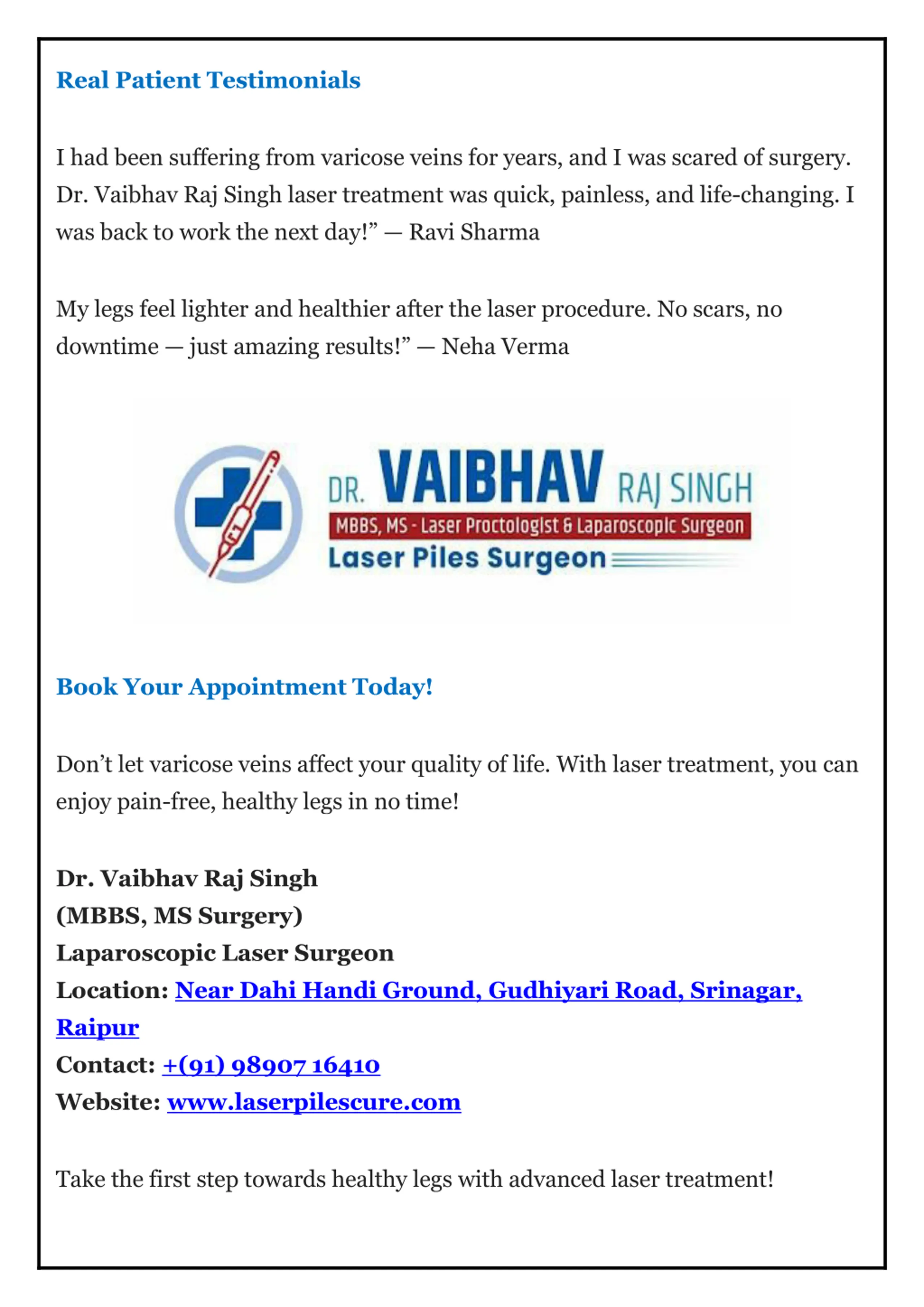 Real Patient Testimonials I had been suffering from varicose veins for years, and I was scared of surgery. Dr. Vaibhav Raj Singh laser treatment was quick, painless, and life-changing. I was back to work the next day! Ravi Sharma My legs feel lighter and healthier after the laser procedure. No scars, no downtime just amazing results! Neha Verma Book Your Appointment Today! Don t let varicose veins affect your quality of life. With laser treatment, you can enjoy pain-free, healthy legs in no time! Dr. Vaibhav Raj Singh (MBBS, MS Surgery) Laparoscopic Laser Surgeon Location: Near Dahi Handi Ground, Gudhiyari Road, Srinagar, Raipur Contact: +(91) 98907 16410 Website: www.laserpilescure.com Take the first step towards healthy legs with advanced laser treatment!