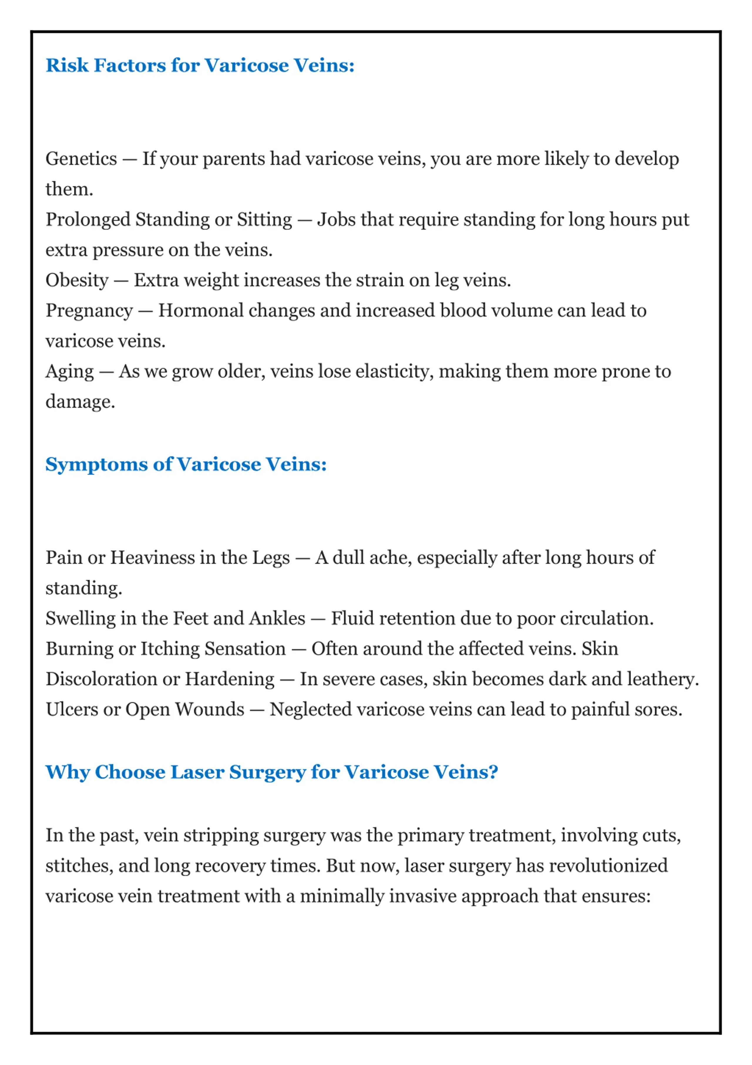 Risk Factors for Varicose Veins: Genetics If your parents had varicose veins, you are more likely to develop them. Prolonged Standing or Sitting Jobs that require standing for long hours put extra pressure on the veins. Obesity Extra weight increases the strain on leg veins. Pregnancy Hormonal changes and increased blood volume can lead to varicose veins. Aging As we grow older, veins lose elasticity, making them more prone to damage. Symptoms of Varicose Veins: Pain or Heaviness in the Legs A dull ache, especially after long hours of standing. Swelling in the Feet and Ankles Fluid retention due to poor circulation. Burning or Itching Sensation Often around the affected veins. Skin Discoloration or Hardening In severe cases, skin becomes dark and leathery. Ulcers or Open Wounds Neglected varicose veins can lead to painful sores. Why Choose Laser Surgery for Varicose Veins? In the past, vein stripping surgery was the primary treatment, involving cuts, stitches, and long recovery times. But now, laser surgery has revolutionized varicose vein treatment with a minimally invasive approach that ensures: