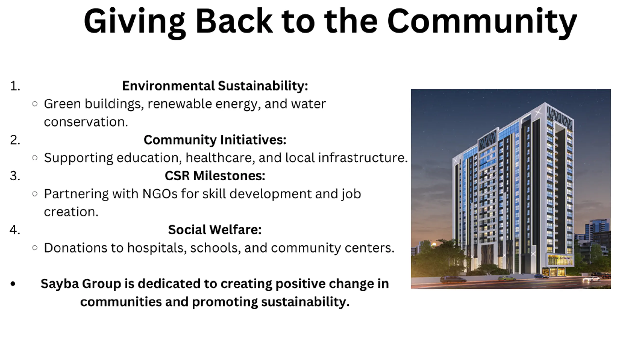 Giving Back to the Community 1. Environmental Sustainability: Green buildings, renewable energy, and water conservation. Community Initiatives: Supporting education, healthcare, and local infrastructure. CSR Milestones: Partnering with NGOs for skill development and job creation. Social Welfare: Donations to hospitals, schools, and community centers. 2. 3. 4. Sayba Group is dedicated to creating positive change in communities and promoting sustainability.