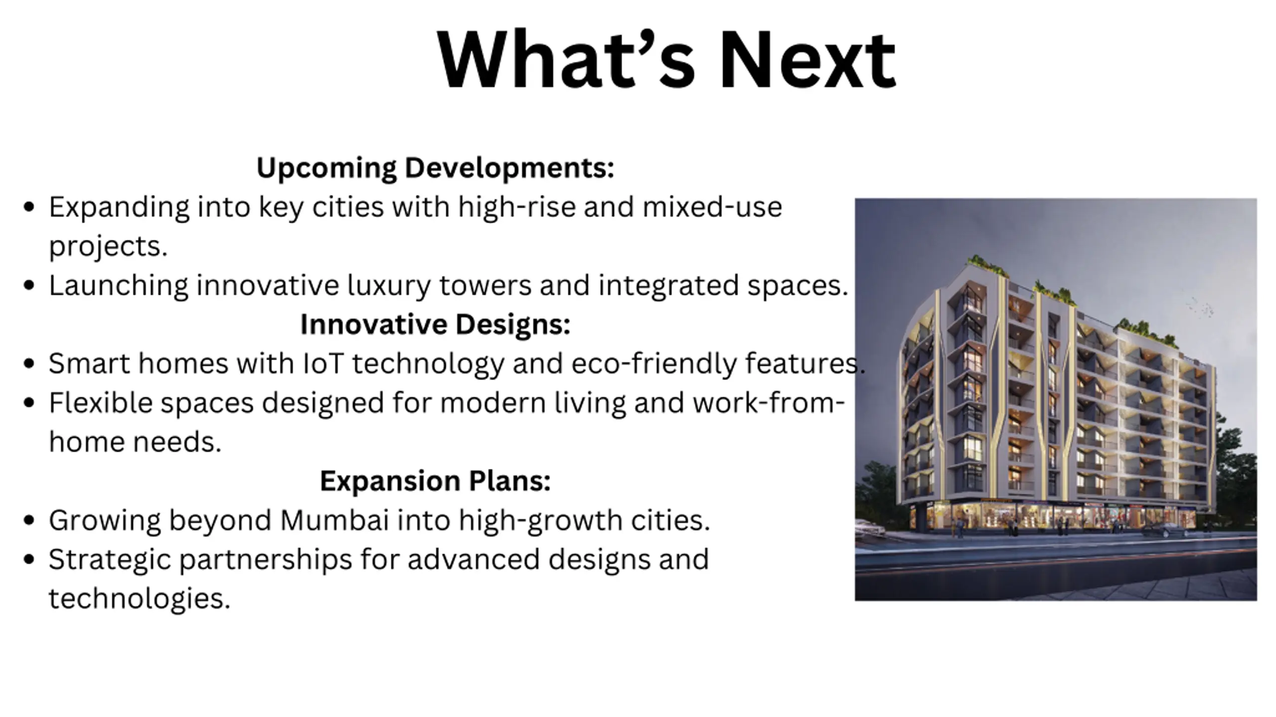 Whats Next Upcoming Developments: Expanding into key cities with high-rise and mixed-use projects. Launching innovative luxury towers and integrated spaces. Innovative Designs: Smart homes with IoT technology and eco-friendly features. Flexible spaces designed for modern living and work-from- home needs. Expansion Plans: Growing beyond Mumbai into high-growth cities. Strategic partnerships for advanced designs and technologies.