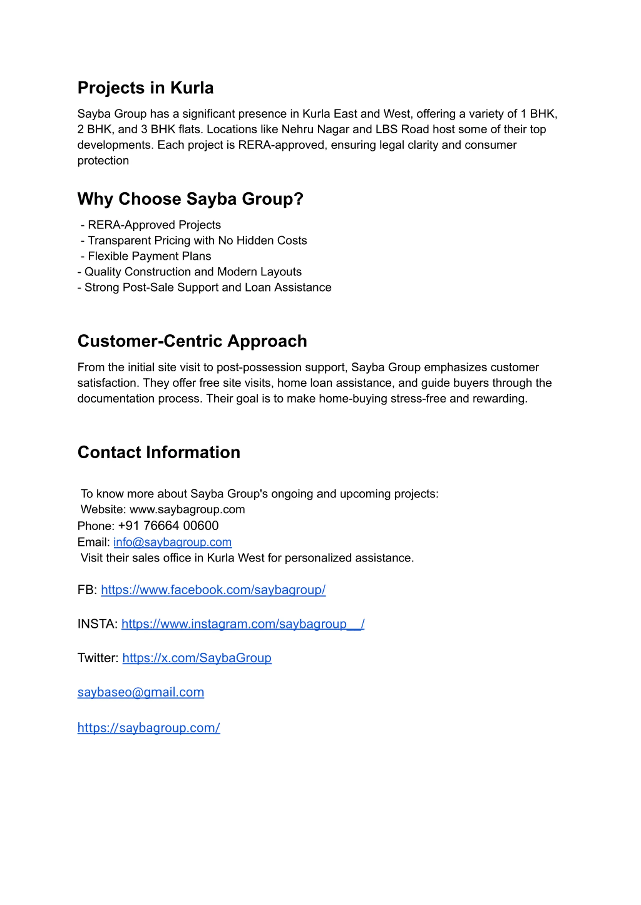 Projects in Kurla Sayba Group has a significant presence in Kurla East and West, offering a variety of 1 BHK, 2 BHK, and 3 BHK flats. Locations like Nehru Nagar and LBS Road host some of their top developments. Each project is RERA-approved, ensuring legal clarity and consumer protection Why Choose Sayba Group? - RERA-Approved Projects - Transparent Pricing with No Hidden Costs - Flexible Payment Plans - Quality Construction and Modern Layouts - Strong Post-Sale Support and Loan Assistance Customer-Centric Approach From the initial site visit to post-possession support, Sayba Group emphasizes customer satisfaction. They offer free site visits, home loan assistance, and guide buyers through the documentation process. Their goal is to make home-buying stress-free and rewarding. Contact Information To know more about Sayba Group's ongoing and upcoming projects: Website: www.saybagroup.com Phone: +91 76664 00600 Email: info@saybagroup.com Visit their sales office in Kurla West for personalized assistance. FB: https://www.facebook.com/saybagroup/ INSTA: https://www.instagram.com/saybagroup__/ Twitter: https://x.com/SaybaGroup saybaseo@gmail.com https://saybagroup.com/