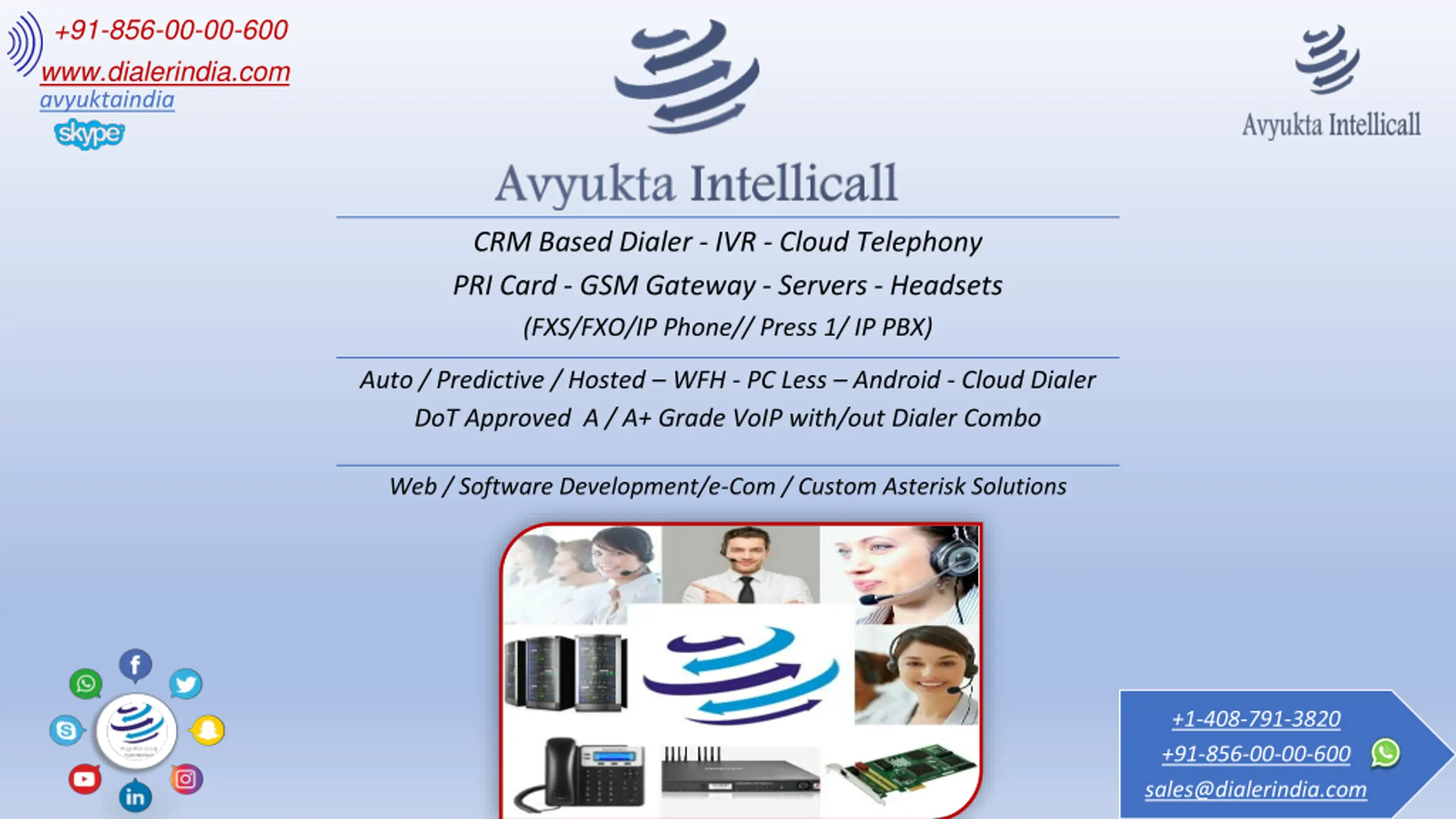 +91-856-00-00-600 www.dialerindia.com avyuktaindia CRM Based Dialer - IVR - Cloud Telephony PRI Card - GSM Gateway - Servers - Headsets (FXS/FXO/IP Phone// Press 1/ IP PBX) Auto / Predictive / Hosted WFH - PC Less Android - Cloud Dialer DoT Approved A / A+ Grade VoIP with/out Dialer Combo Web / Software Development/e-Com / Custom Asterisk Solutions +1-408-791-3820 +91-856-00-00-600 sales@dialerindia.com