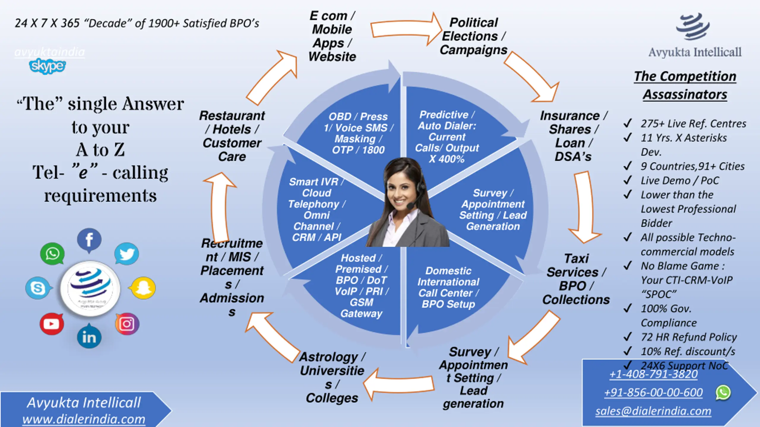 E com / Mobile Apps / Website Political Elections / Campaigns 24 X 7 X 365 Decade of 1900+ Satisfied BPO s avyuktaindia The Competition Assassinators The single Answer to your A to Z Tel- e - calling requirements Restaurant / Hotels / Customer Care Insurance / Shares / Loan / DSA s Predictive / Auto Dialer: Current Calls/ Output X 400% OBD / Press 1/ Voice SMS / Masking / OTP / 1800 275+ Live Ref. Centres 11 Yrs. X Asterisks Dev. 9 Countries,91+ Cities Live Demo / PoC Lower than the Lowest Professional Bidder All possible Techno- commercial models No Blame Game : Your CTI-CRM-VoIP SPOC 100% Gov. Compliance 72 HR Refund Policy 10% Ref. discount/s 24X6 Support NoC Smart IVR / Cloud Telephony / Omni Channel / CRM / API Survey / Appointment Setting / Lead Generation Recruitme nt / MIS / Placement s / Admission s Taxi Hosted / Premised / BPO / DoT VoIP / PRI / GSM Gateway Services / BPO / Collections Domestic International Call Center / BPO Setup Survey / Appointmen t Setting / Lead generation Astrology / Universitie s / Colleges +1-408-791-3820 +91-856-00-00-600 sales@dialerindia.com Avyukta Intellicall www.dialerindia.com