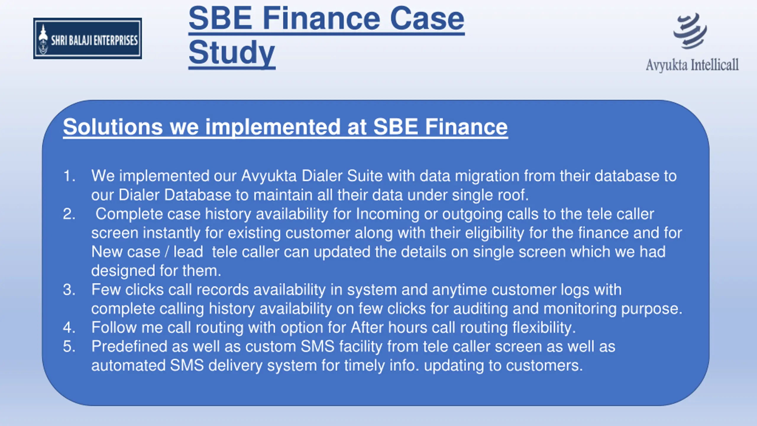 SBE Finance Case Study Solutions we implemented at SBE Finance 1. We implemented our Avyukta Dialer Suite with data migration from their database to our Dialer Database to maintain all their data under single roof. Complete case history availability for Incoming or outgoing calls to the tele caller screen instantly for existing customer along with their eligibility for the finance and for New case / lead tele caller can updated the details on single screen which we had designed for them. Few clicks call records availability in system and anytime customer logs with complete calling history availability on few clicks for auditing and monitoring purpose. Follow me call routing with option for After hours call routing flexibility. Predefined as well as custom SMS facility from tele caller screen as well as automated SMS delivery system for timely info. updating to customers. 2. 3. 4. 5.