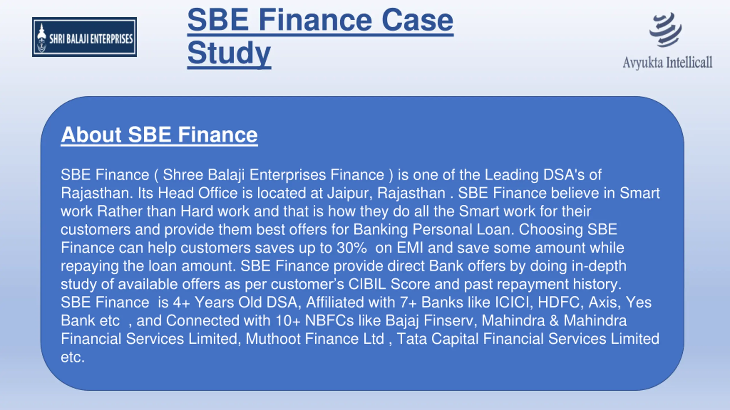 SBE Finance Case Study About SBE Finance SBE Finance ( Shree Balaji Enterprises Finance ) is one of the Leading DSA's of Rajasthan. Its Head Office is located at Jaipur, Rajasthan . SBE Finance believe in Smart work Rather than Hard work and that is how they do all the Smart work for their customers and provide them best offers for Banking Personal Loan. Choosing SBE Finance can help customers saves up to 30% on EMI and save some amount while repaying the loan amount. SBE Finance provide direct Bank offers by doing in-depth study of available offers as per customer s CIBIL Score and past repayment history. SBE Finance is 4+ Years Old DSA, Affiliated with 7+ Banks like ICICI, HDFC, Axis, Yes Bank etc , and Connected with 10+ NBFCs like Bajaj Finserv, Mahindra & Mahindra Financial Services Limited, Muthoot Finance Ltd , Tata Capital Financial Services Limited etc.