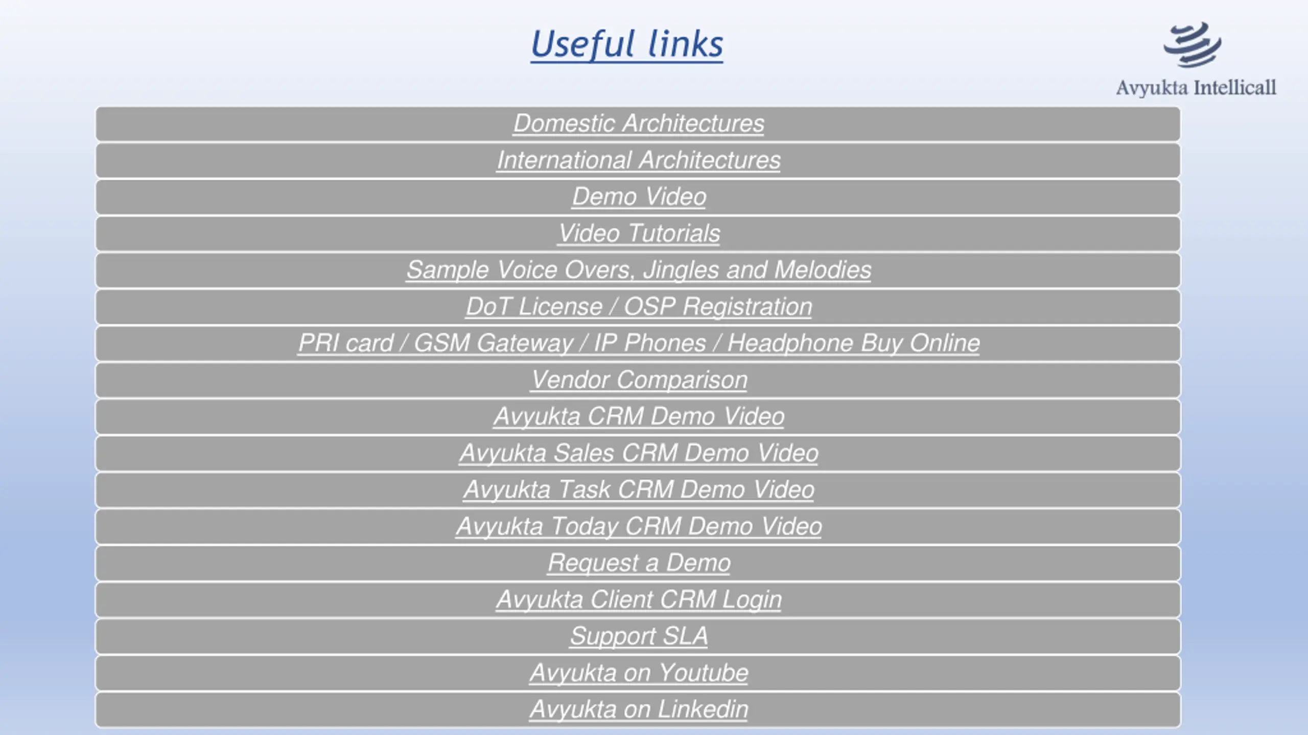 Useful links Domestic Architectures International Architectures Demo Video Video Tutorials Sample Voice Overs, Jingles and Melodies DoT License / OSP Registration PRI card / GSM Gateway / IP Phones / Headphone Buy Online Vendor Comparison Avyukta CRM Demo Video Avyukta Sales CRM Demo Video Avyukta Task CRM Demo Video Avyukta Today CRM Demo Video Request a Demo Avyukta Client CRM Login Support SLA Avyukta on Youtube Avyukta on Linkedin