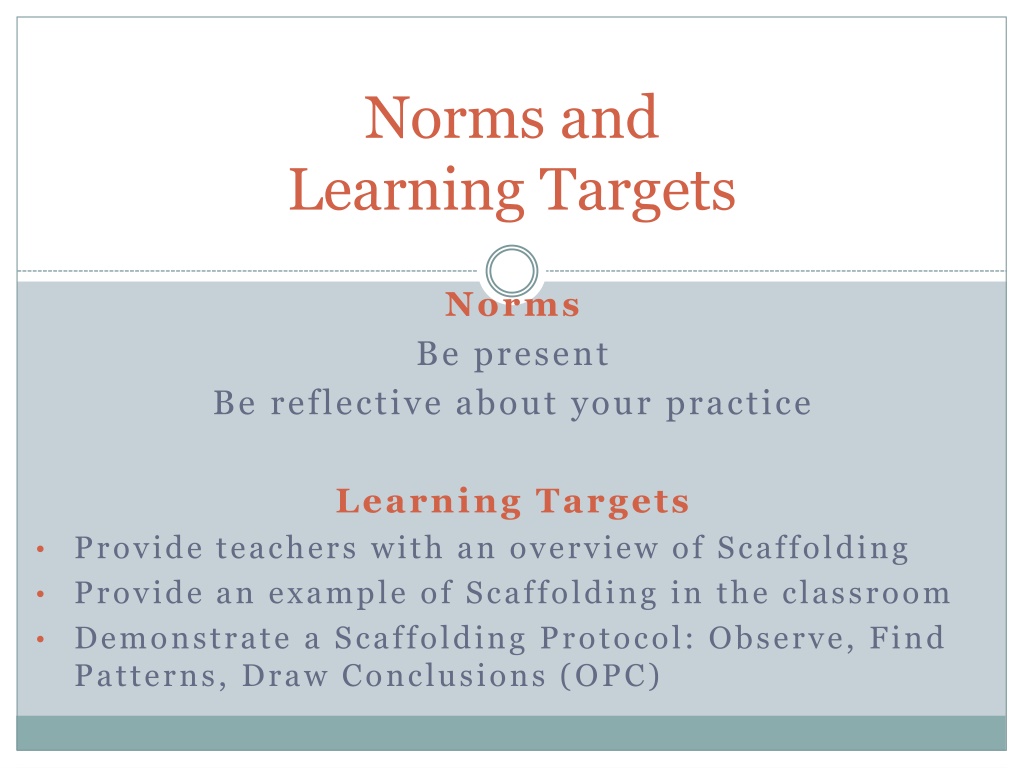 Norms and Learning Targets Norms Be present Be reflective about your practice Learning Targets Provide teachers with an overview of Scaffolding Provide an example of Scaffolding in the classroom Demonstrate a Scaffolding Protocol: Observe, Find Patterns, Draw Conclusions (OPC)