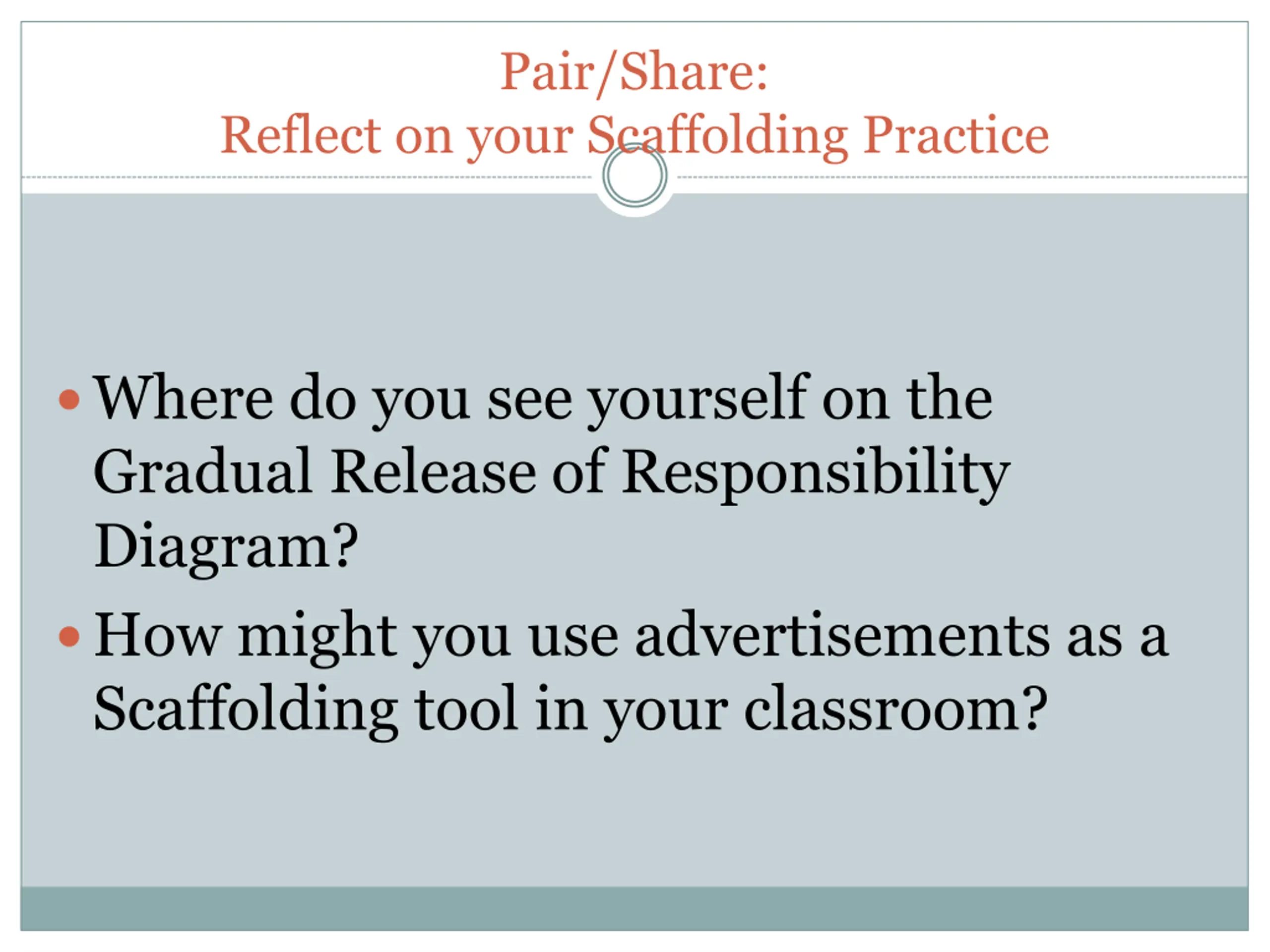 Pair/Share: Reflect on your Scaffolding Practice Where do you see yourself on the Gradual Release of Responsibility Diagram? How might you use advertisements as a Scaffolding tool in your classroom?