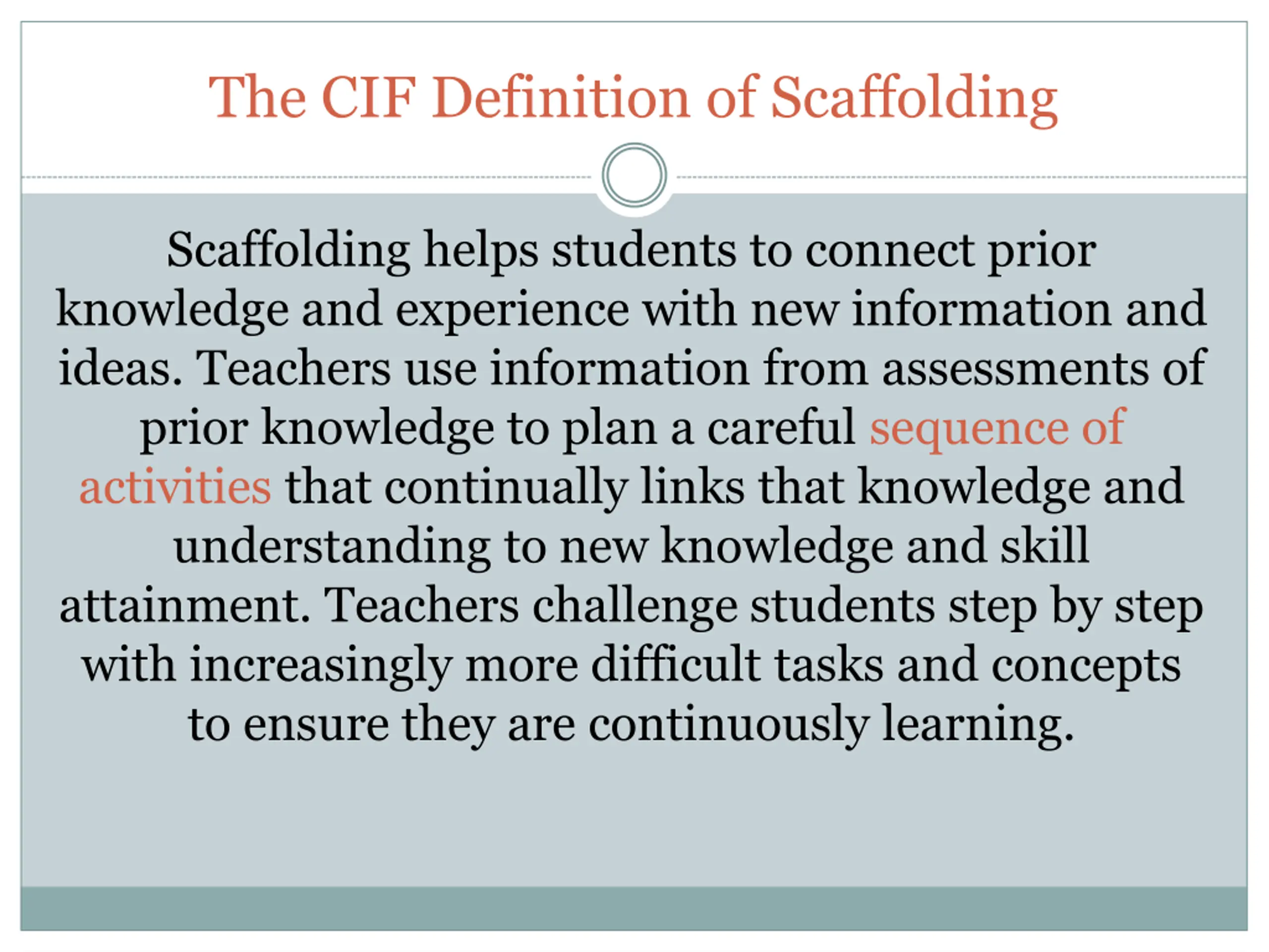 The CIF Definition of Scaffolding Scaffolding helps students to connect prior knowledge and experience with new information and ideas. Teachers use information from assessments of prior knowledge to plan a careful sequence of activities that continually links that knowledge and understanding to new knowledge and skill attainment. Teachers challenge students step by step with increasingly more difficult tasks and concepts to ensure they are continuously learning.