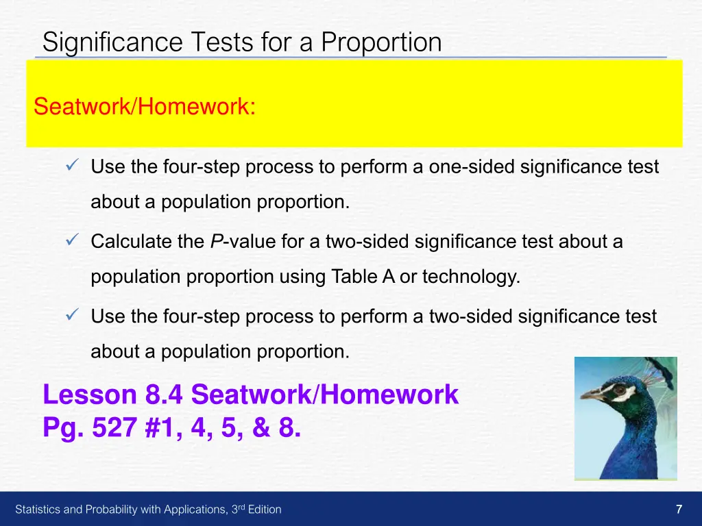 Significance Tests for a Proportion Learning Targets After this lesson, you should be able to: After this lesson, you should be able to: Learning Targets Use the four-step process to perform a one-sided significance test about a population proportion. Calculate the P-value for a two-sided significance test about a population proportion using Table A or technology. Use the four-step process to perform a two-sided significance test about a population proportion. Statistics and Probability with Applications, 3rd Edition 2 2