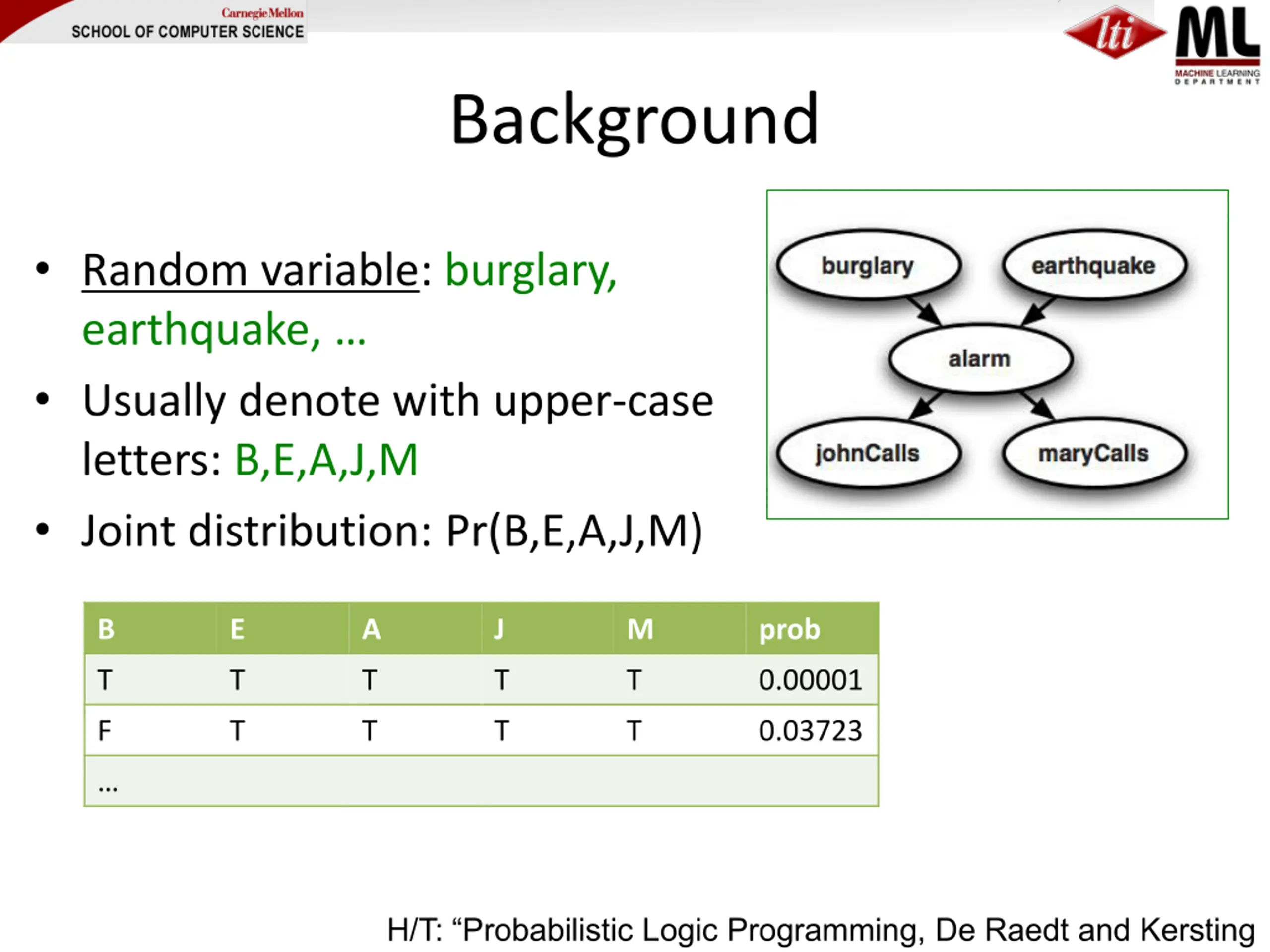 Background Random variable: burglary, earthquake, Usually denote with upper-case letters: B,E,A,J,M Joint distribution: Pr(B,E,A,J,M) B E A J M prob T T T T T 0.00001 F T T T T 0.03723 H/T: Probabilistic Logic Programming, De Raedt and Kersting