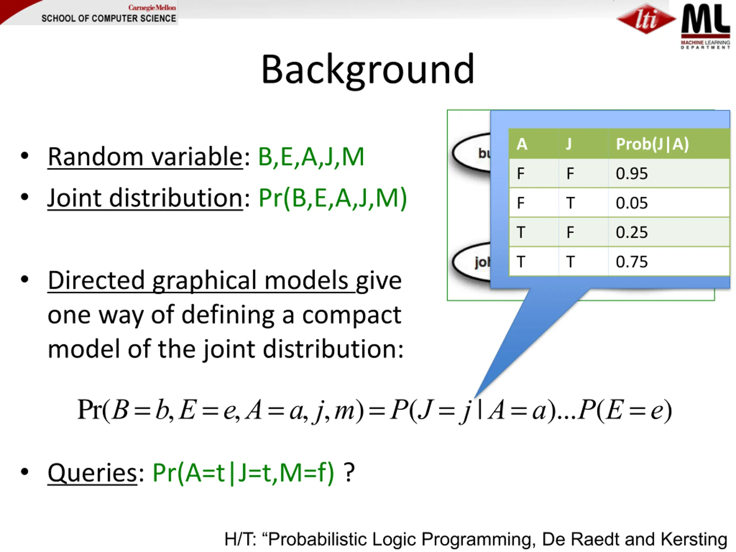Background A J Prob(J|A) Random variable: B,E,A,J,M Joint distribution: Pr(B,E,A,J,M) F F 0.95 F T 0.05 T F 0.25 T T 0.75 Directed graphical models give one way of defining a compact model of the joint distribution: Pr(B=b,E =e,A=a, j,m)=P(J = j|A=a)...P(E =e) Queries: Pr(A=t|J=t,M=f) ? H/T: Probabilistic Logic Programming, De Raedt and Kersting