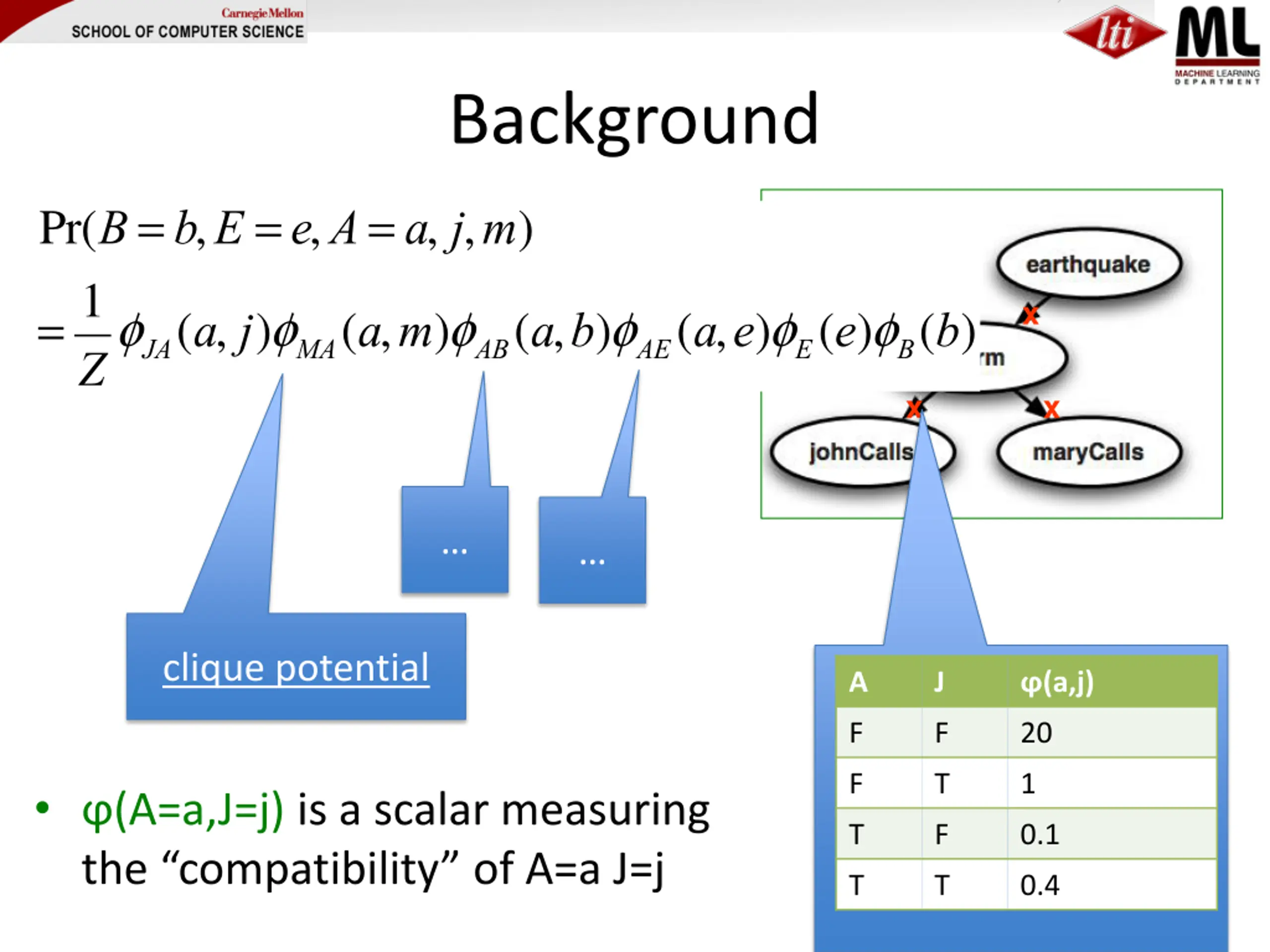 Background Pr(B=b,E =e,A= a, j,m) =1 ZfJA(a, j)fMA(a,m)fAB(a,b)fAE(a,e)fE(e)fB(b) x x x x clique potential A J (a,j) F F 20 F T 1 (A=a,J=j) is a scalar measuring the compatibility of A=a J=j T F 0.1 T T 0.4