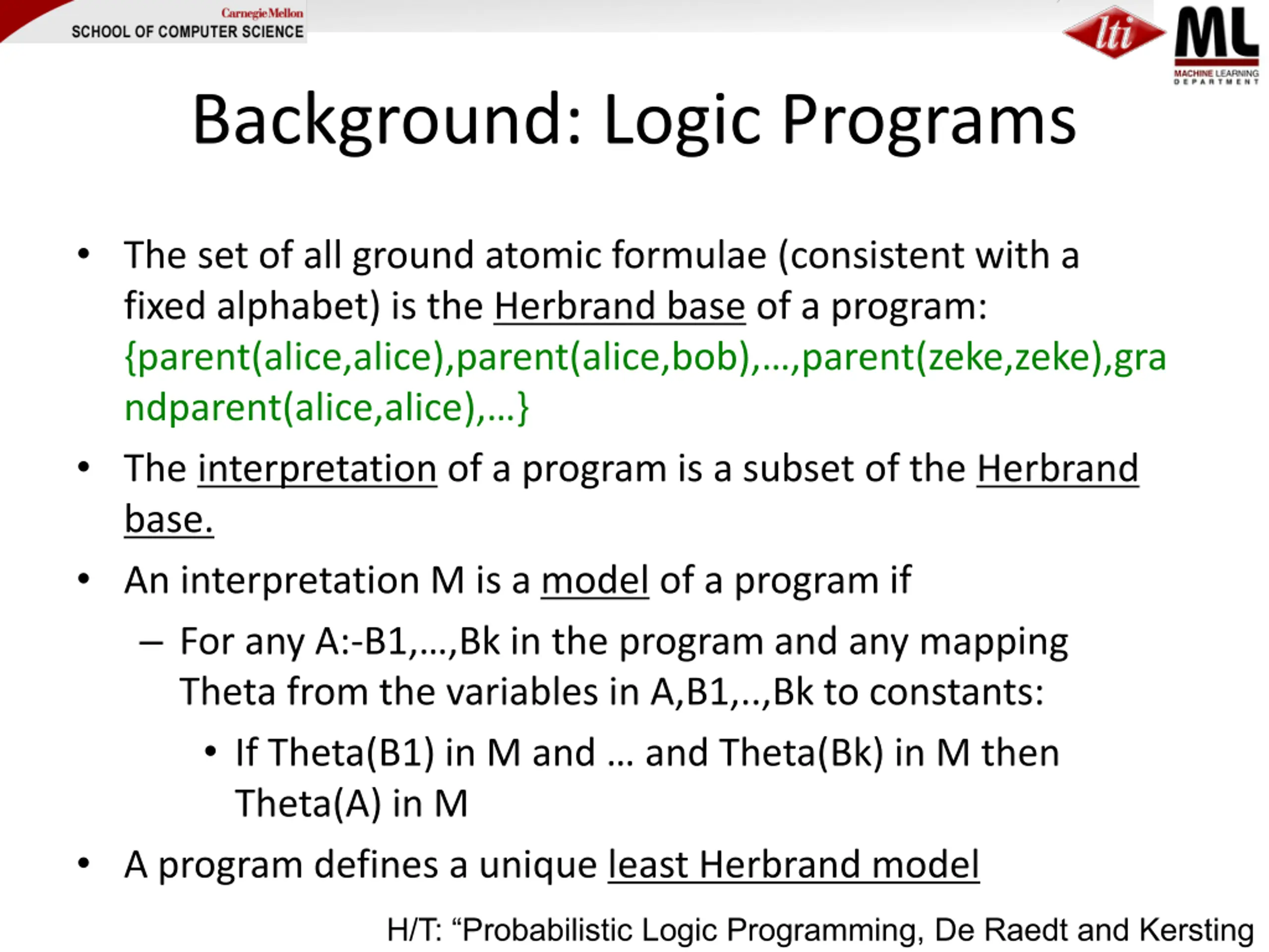 Background: Logic Programs The set of all ground atomic formulae (consistent with a fixed alphabet) is the Herbrand base of a program: {parent(alice,alice),parent(alice,bob), ,parent(zeke,zeke),gra ndparent(alice,alice), } The interpretation of a program is a subset of the Herbrand base. An interpretation M is a model of a program if For any A:-B1, ,Bk in the program and any mapping Theta from the variables in A,B1,..,Bk to constants: If Theta(B1) in M and and Theta(Bk) in M then Theta(A) in M A program defines a unique least Herbrand model H/T: Probabilistic Logic Programming, De Raedt and Kersting