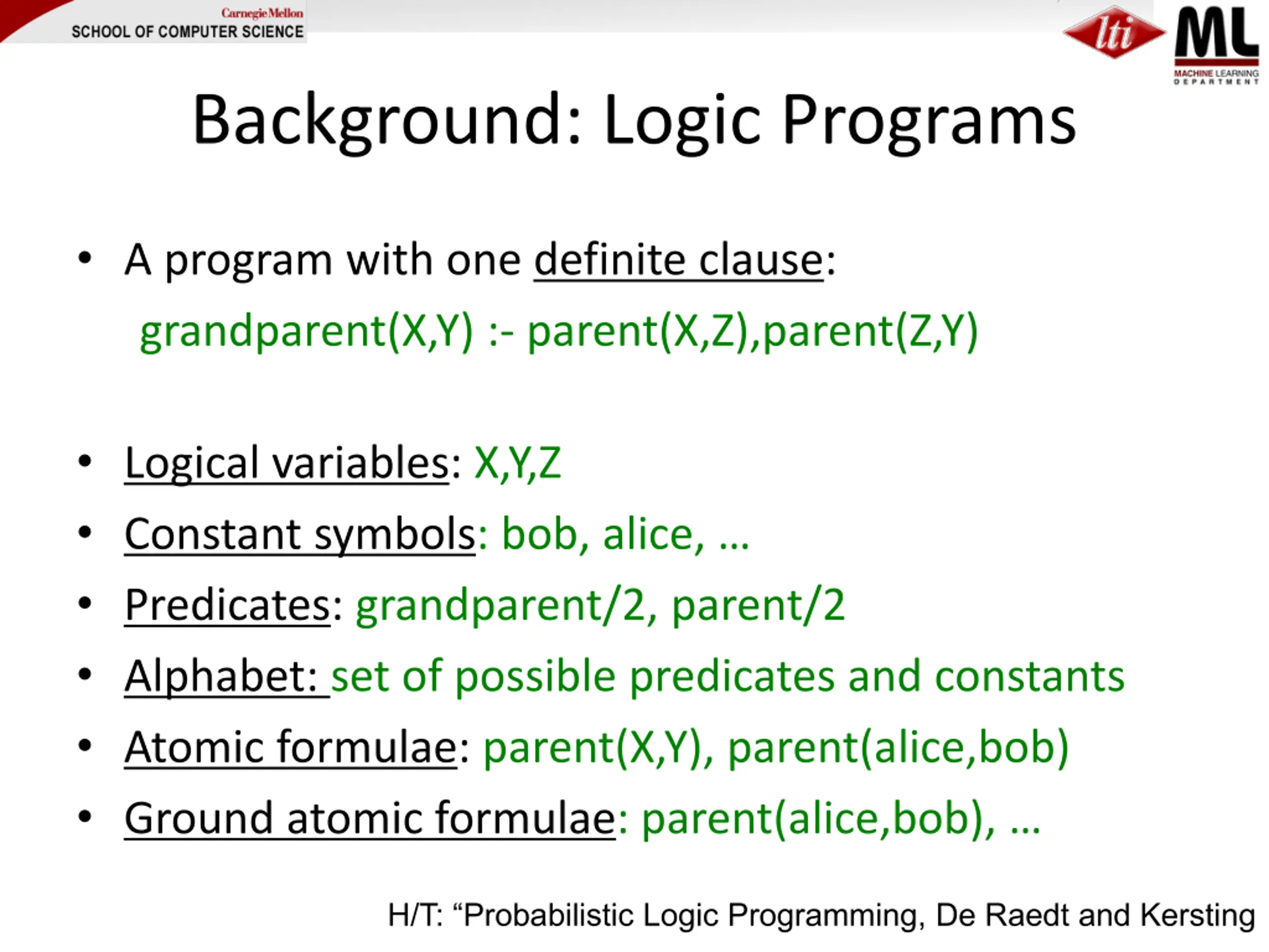 Background: Logic Programs A program with one definite clause: grandparent(X,Y) :- parent(X,Z),parent(Z,Y) Logical variables: X,Y,Z Constant symbols: bob, alice, Predicates: grandparent/2, parent/2 Alphabet: set of possible predicates and constants Atomic formulae: parent(X,Y), parent(alice,bob) Ground atomic formulae: parent(alice,bob), H/T: Probabilistic Logic Programming, De Raedt and Kersting