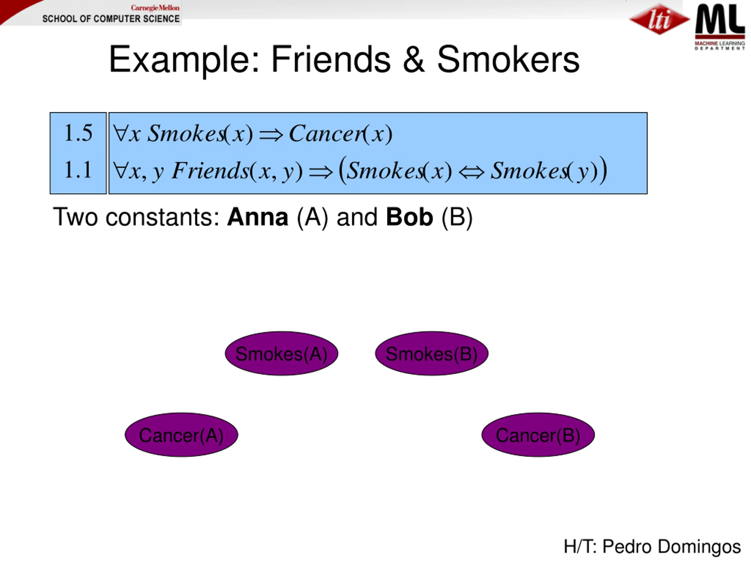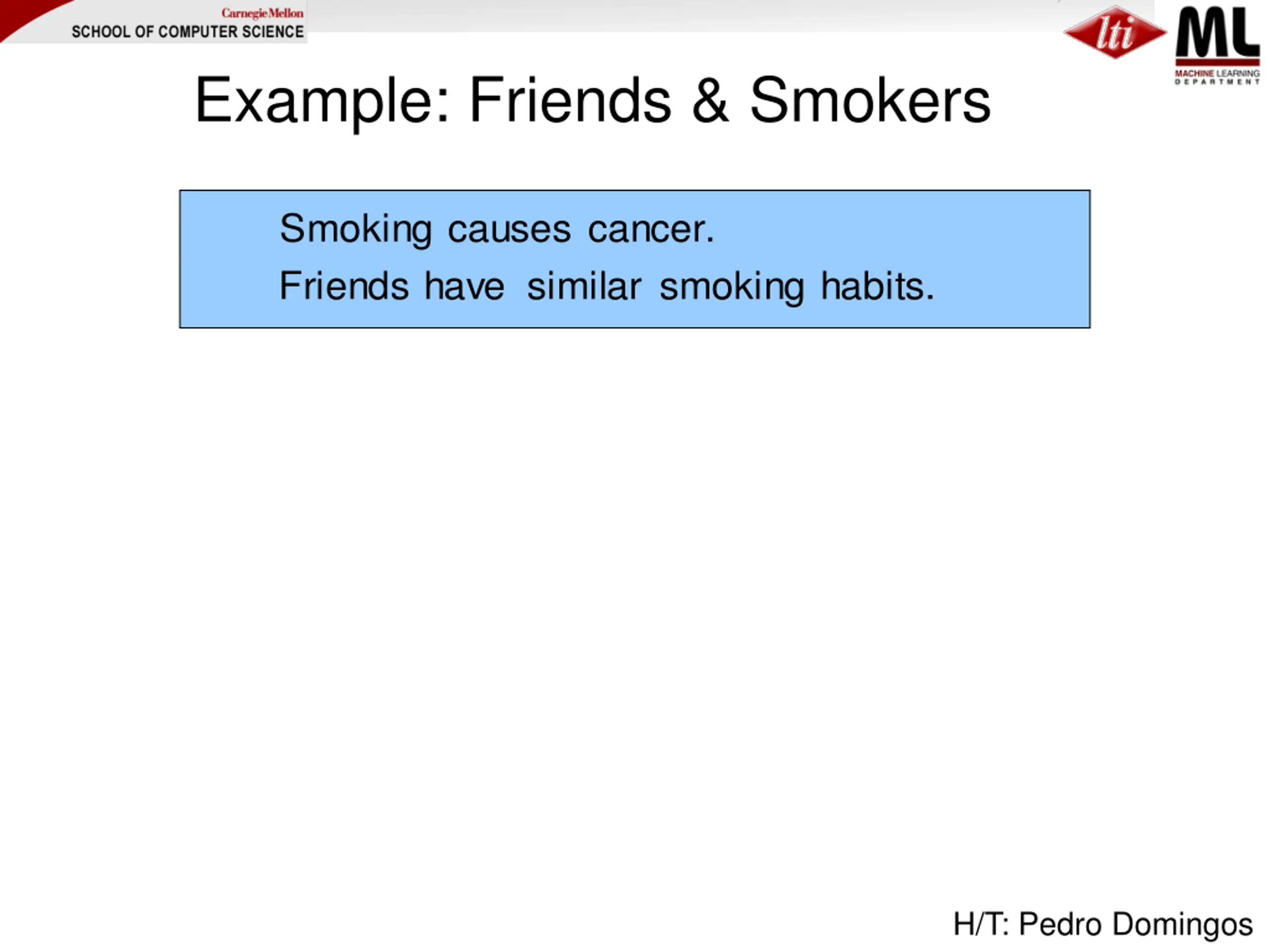 Example: Friends & Smokers ( ) ( ) x Smokes x Cancer x ( ) ) y , ( , ) ( ) ( x y Friends x y Smokes x Smokes H/T: Pedro Domingos