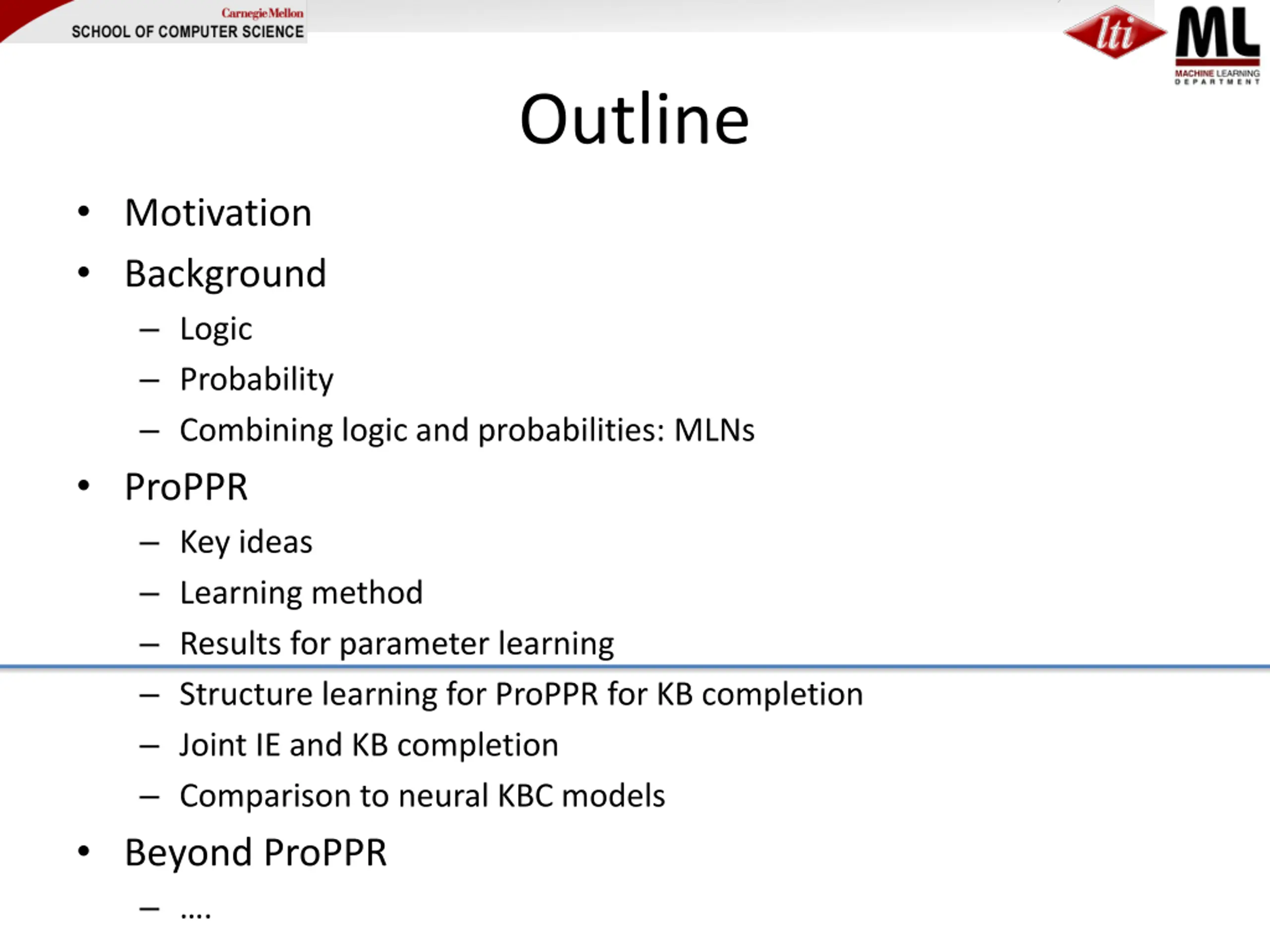 Outline Motivation Background Logic Probability Combining logic and probabilities: MLNs ProPPR Key ideas Learning method Results for parameter learning Structure learning for ProPPR for KB completion Joint IE and KB completion Comparison to neural KBC models Beyond ProPPR .