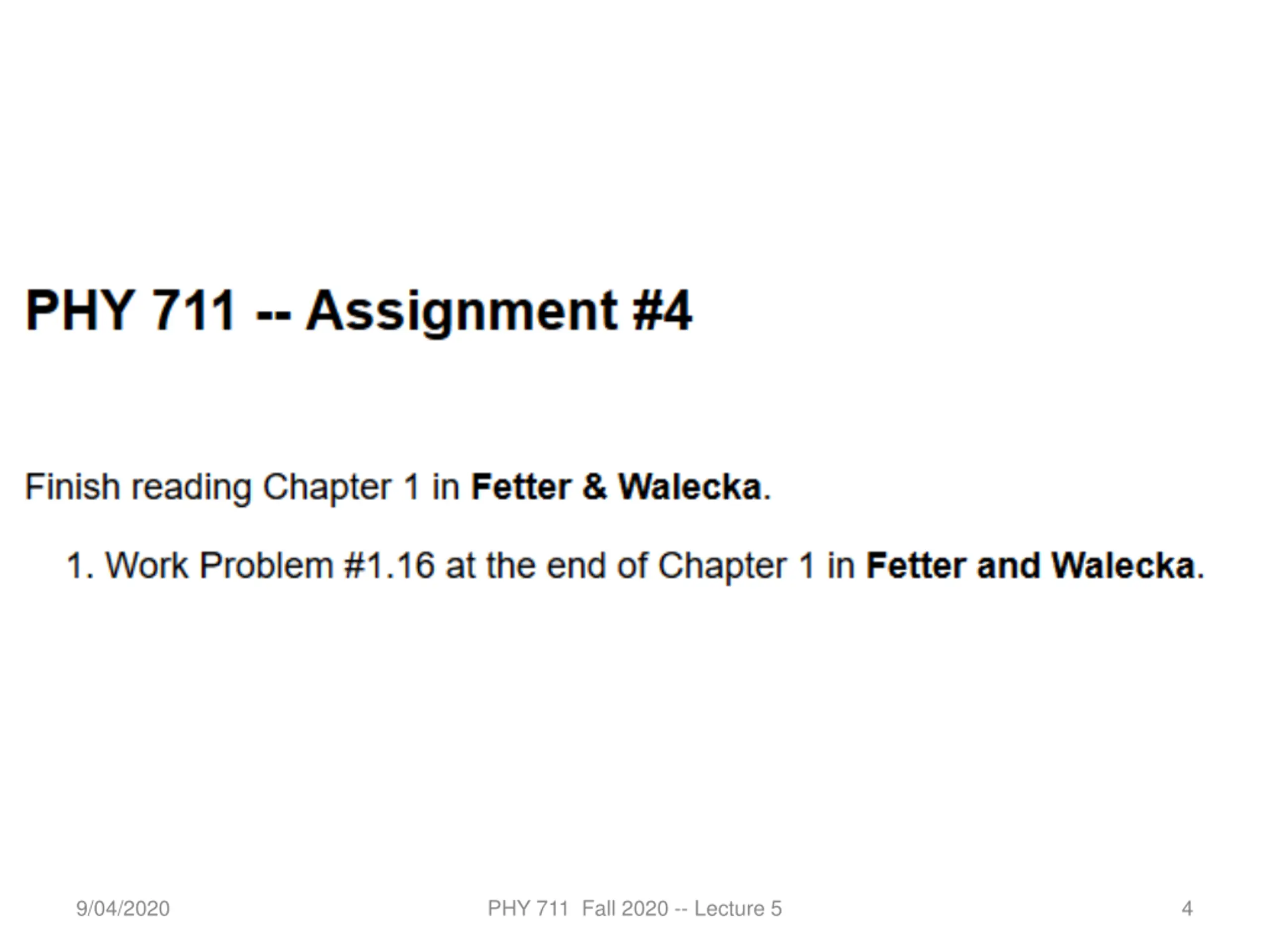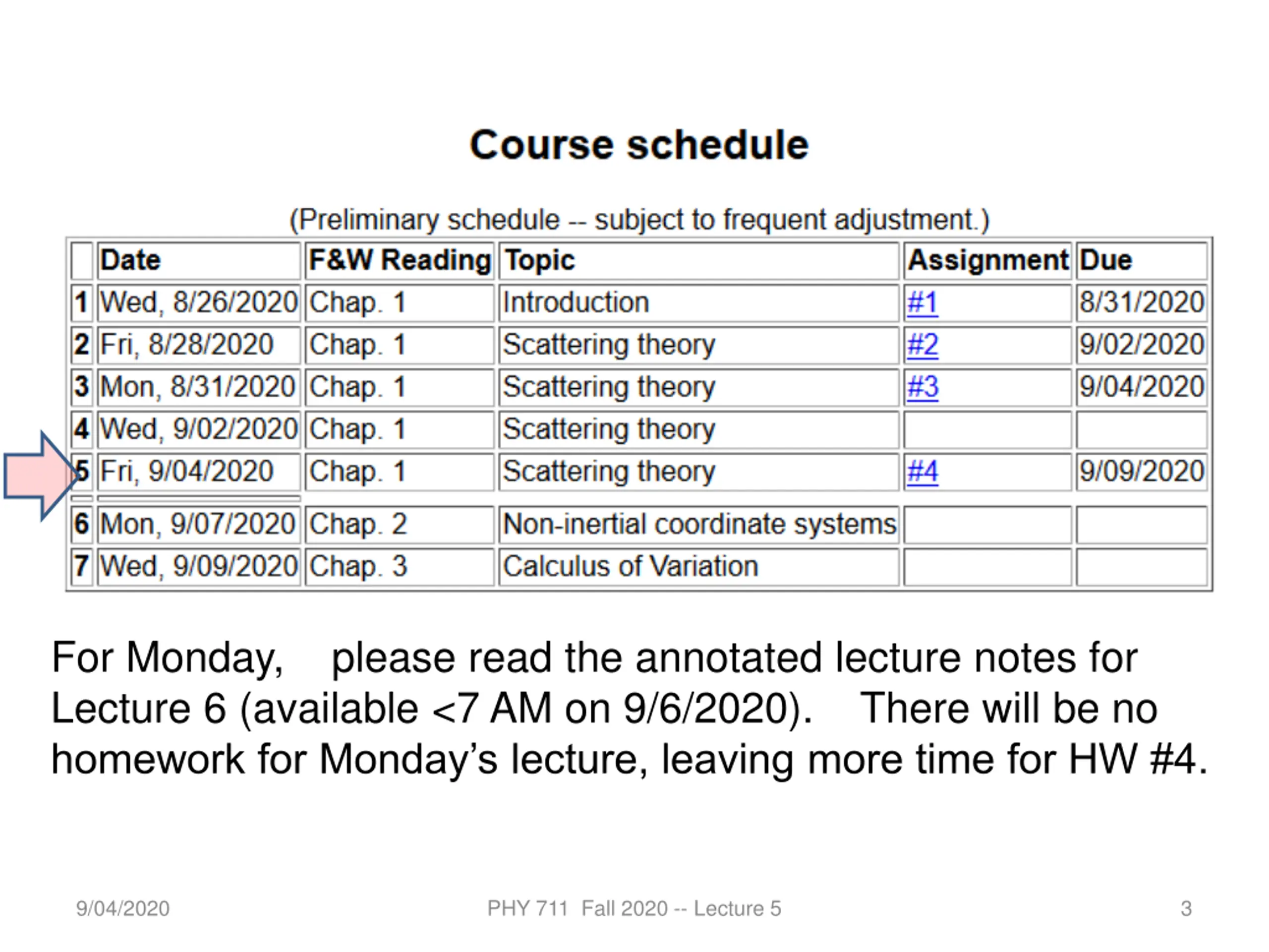 For Monday, please read the annotated lecture notes for Lecture 6 (available <7 AM on 9/6/2020). There will be no homework for Monday s lecture, leaving more time for HW #4. 9/04/2020 PHY 711 Fall 2020 -- Lecture 5 3