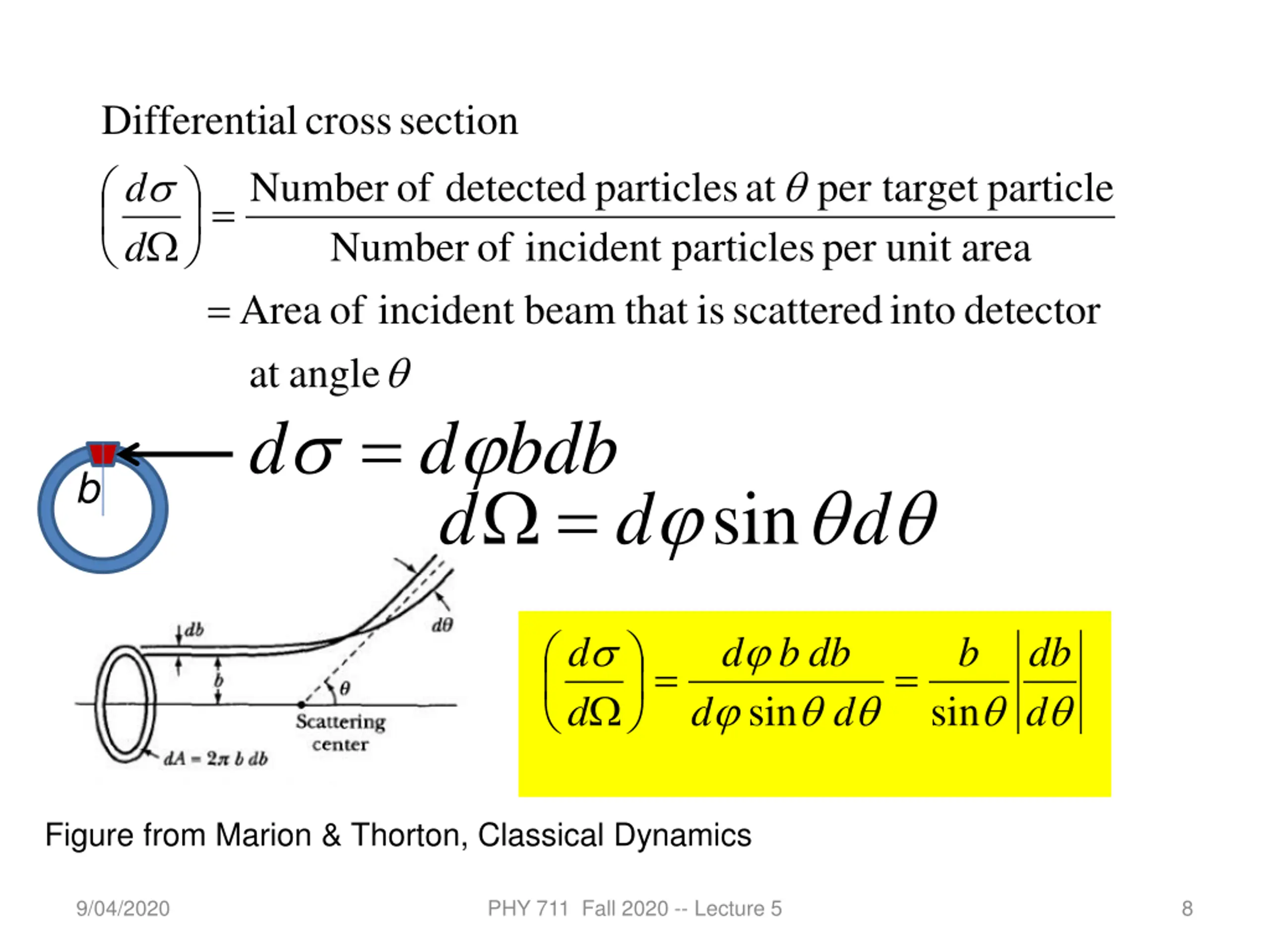 Differenti d cross al section d Number of detected particles at per target particle = Number of incident particles per unit area Area = of scattered is that beam incident detector into = angle at d d bdb d = b d sin d d d d b db b db = = d d d sin sin Figure from Marion & Thorton, Classical Dynamics 9/04/2020 PHY 711 Fall 2020 -- Lecture 5 8