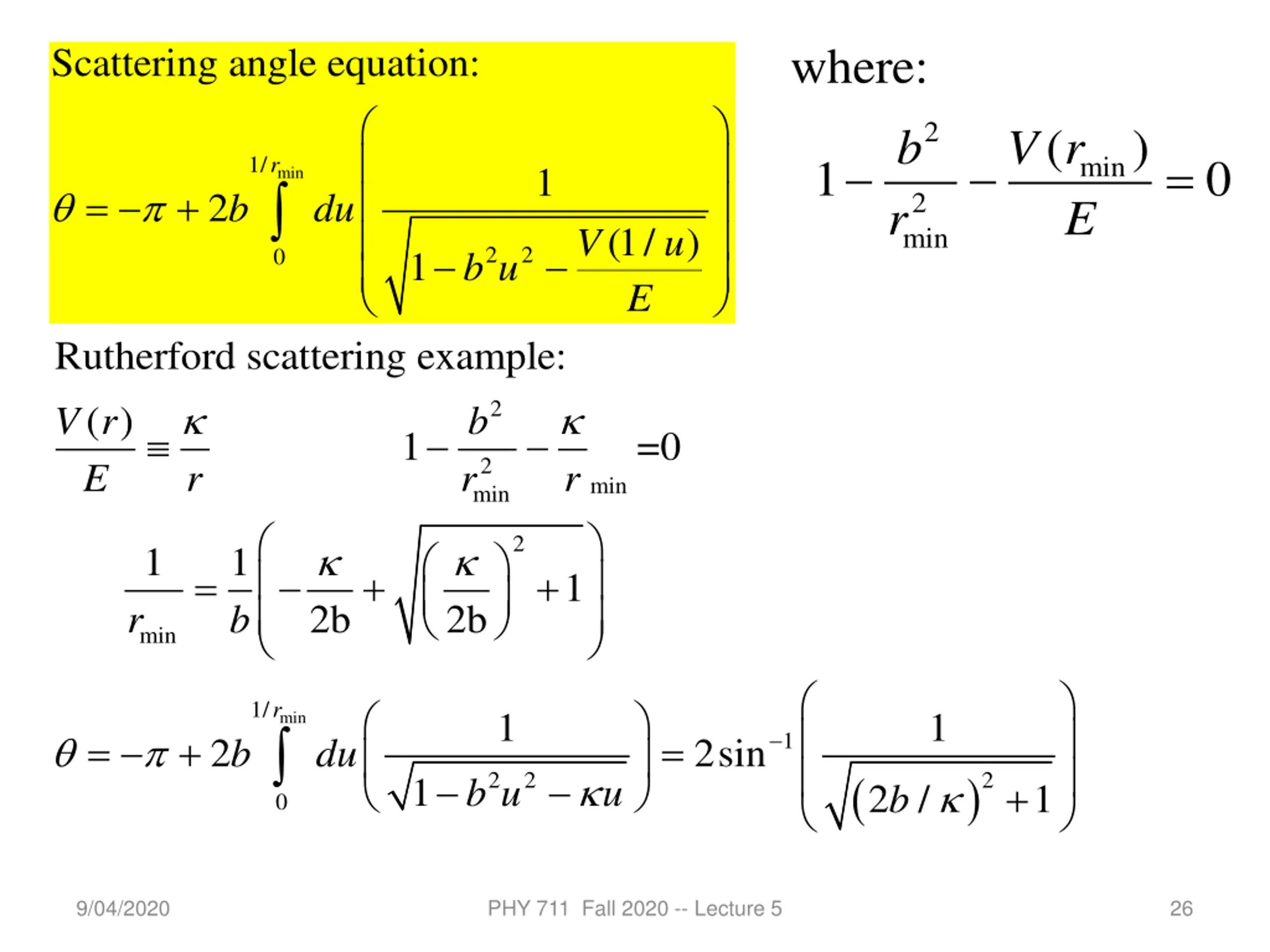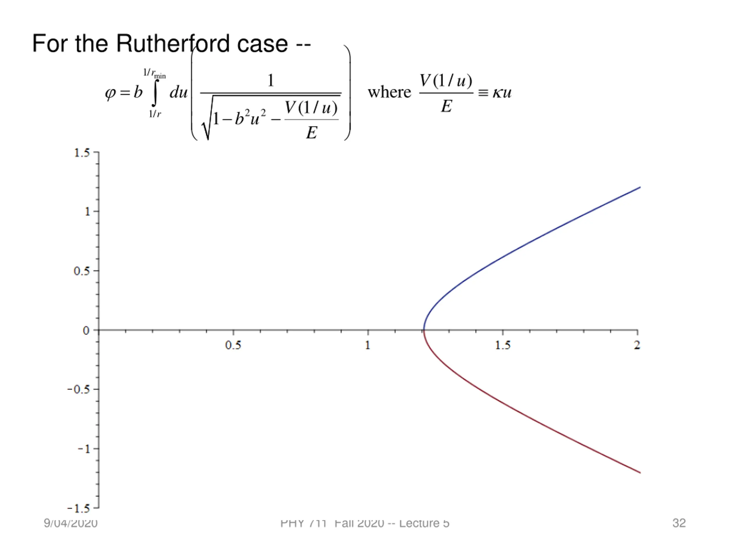 For the Rutherford case -- 1/ min r 1 (1/ ) E V u = where b du u (1/ ) E V u 2 2 1 1/ r b u 9/04/2020 PHY 711 Fall 2020 -- Lecture 5 32