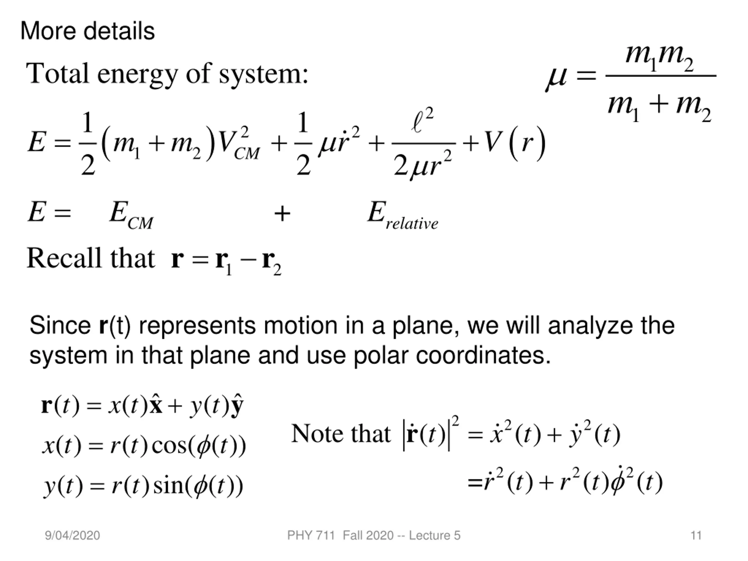 More details m m = 1 + 2 Total energy of system: 1 2 + Recall that = r m m 2 1 2 1 2 ( ) ( ) r = + + + + 2 2 E m m V r V 1 2 CM 2 2 r = E E relative E CM r r 1 2 Since r(t) represents motion in a plane, we will analyze the system in that plane and use polar coordinates. = = = + r x y ( ) ( ) ( ) y t ( ) ( )cos( ( )) ( )sin( ( )) r t ( ) y t t x t r t 2 = + 2 2 r Note that ( ) ( ) ( ) t x t y t x t t t + 2 2 2 = ( ) ( ) ( ) t r t r t 9/04/2020 PHY 711 Fall 2020 -- Lecture 5 11