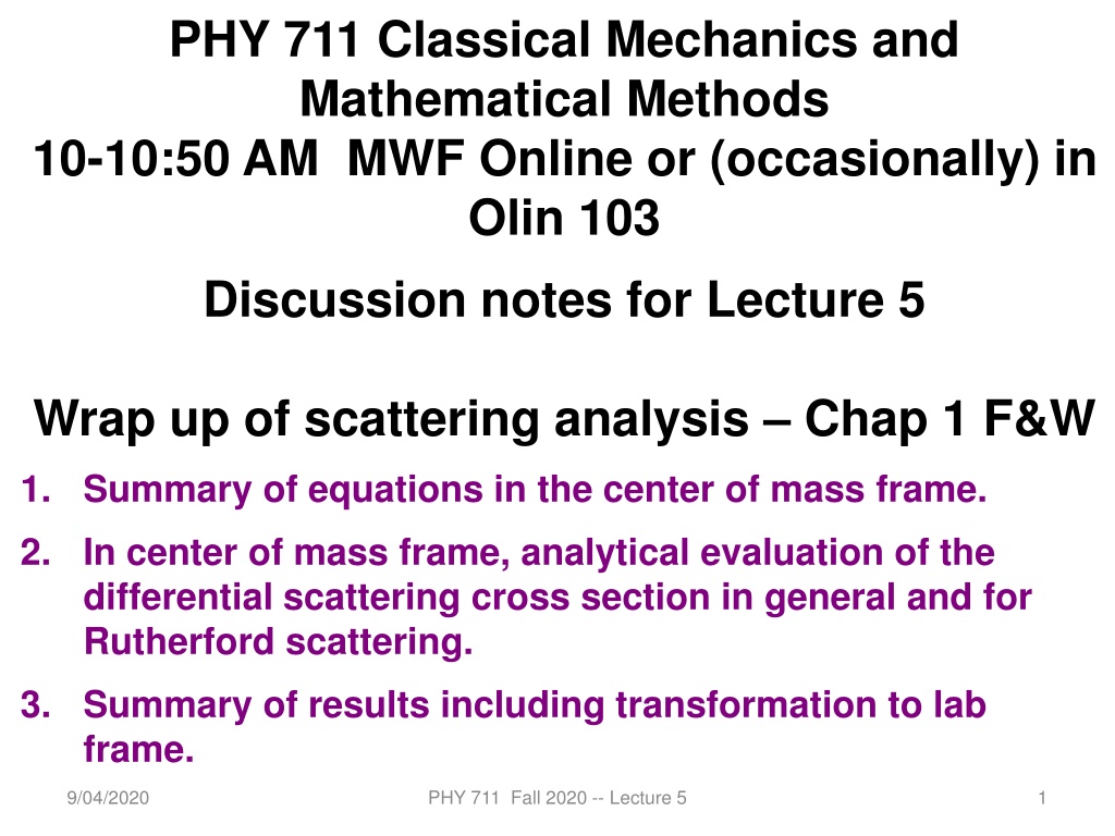 PHY 711 Classical Mechanics and Mathematical Methods 10-10:50 AM MWF Online or (occasionally) in Olin 103 Discussion notes for Lecture 5 Wrap up of scattering analysis Chap 1 F&W 1. Summary of equations in the center of mass frame. 2. In center of mass frame, analytical evaluation of the differential scattering cross section in general and for Rutherford scattering. 3. Summary of results including transformation to lab frame. 9/04/2020 PHY 711 Fall 2020 -- Lecture 5 1