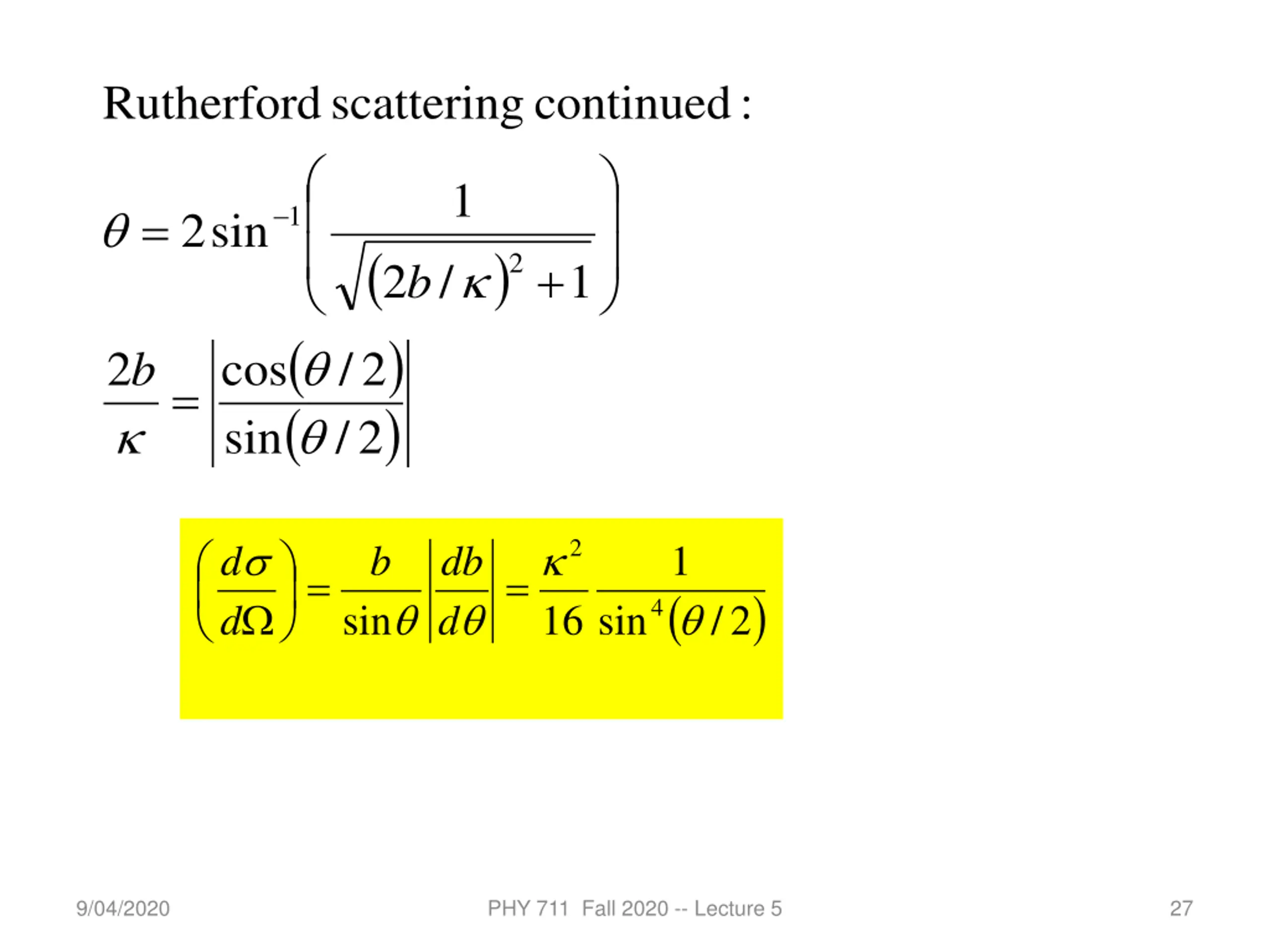 Rutherford scattering continued : 1 = 1 2 sin ( ) 2 + 2 / 1 b ( ( ) 2 cos / 2 b = ) 2 / sin d 2 1 d b db = = ( ) d 4 sin 16 sin / 2 9/04/2020 PHY 711 Fall 2020 -- Lecture 5 27