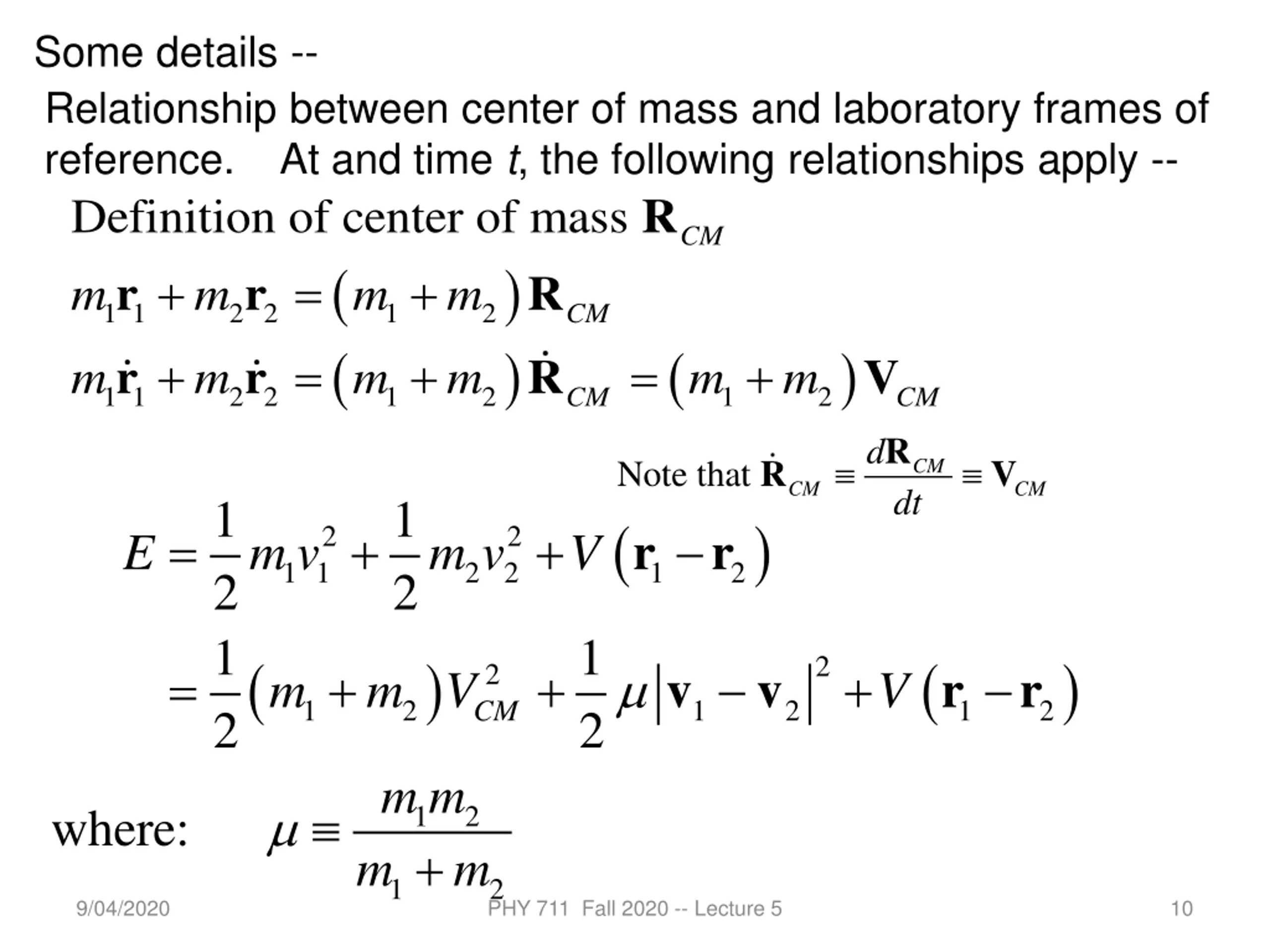 Some details -- Relationship between center of mass and laboratory frames of reference. At and time t, the following relationships apply -- Definition of center of mass m m m m + = + + = + = r r R R CM ( ( ) ) 1 1 r 2 2 r R 1 2 CM ( ) + V m m m m m m 1 1 2 2 1 2 1 2 CM CM R d R V Note that CM CM CM dt 1 2 1 2 1 2 ( ) = + + 2 2 r r E m 1 1 v m 2 2 v V 1 2 1 2 ( ) ( ) 2 = + + + 2 v v r r m m V V 1 2 1 2 1 2 CM m m where: 1 + 2 m m 1 2 9/04/2020 PHY 711 Fall 2020 -- Lecture 5 10