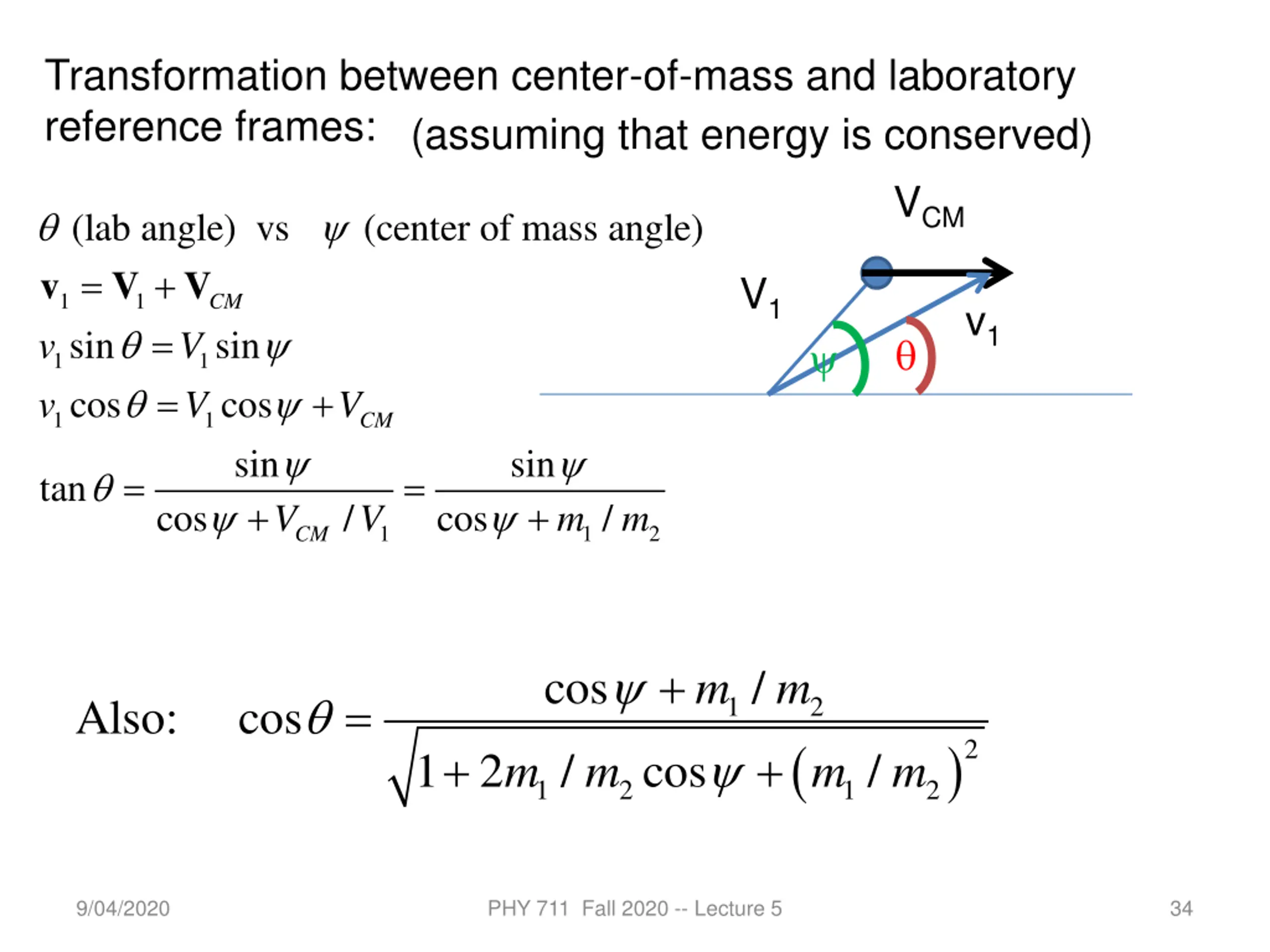 Transformation between center-of-mass and laboratory reference frames: (assuming that energy is conserved) VCM (lab an = v (center of mass angle gle) vs V ) + = = V V1 1 1 CM v1 + sin cos sin cos sin v v V V 1 1 + V 1 1 CM sin + = = t an cos / co s / V V m m 1 1 2 CM + cos / m m = Also: cos 1 2 m ( ) 2 1 2 + + / cos / m m m 1 2 1 2 9/04/2020 PHY 711 Fall 2020 -- Lecture 5 34