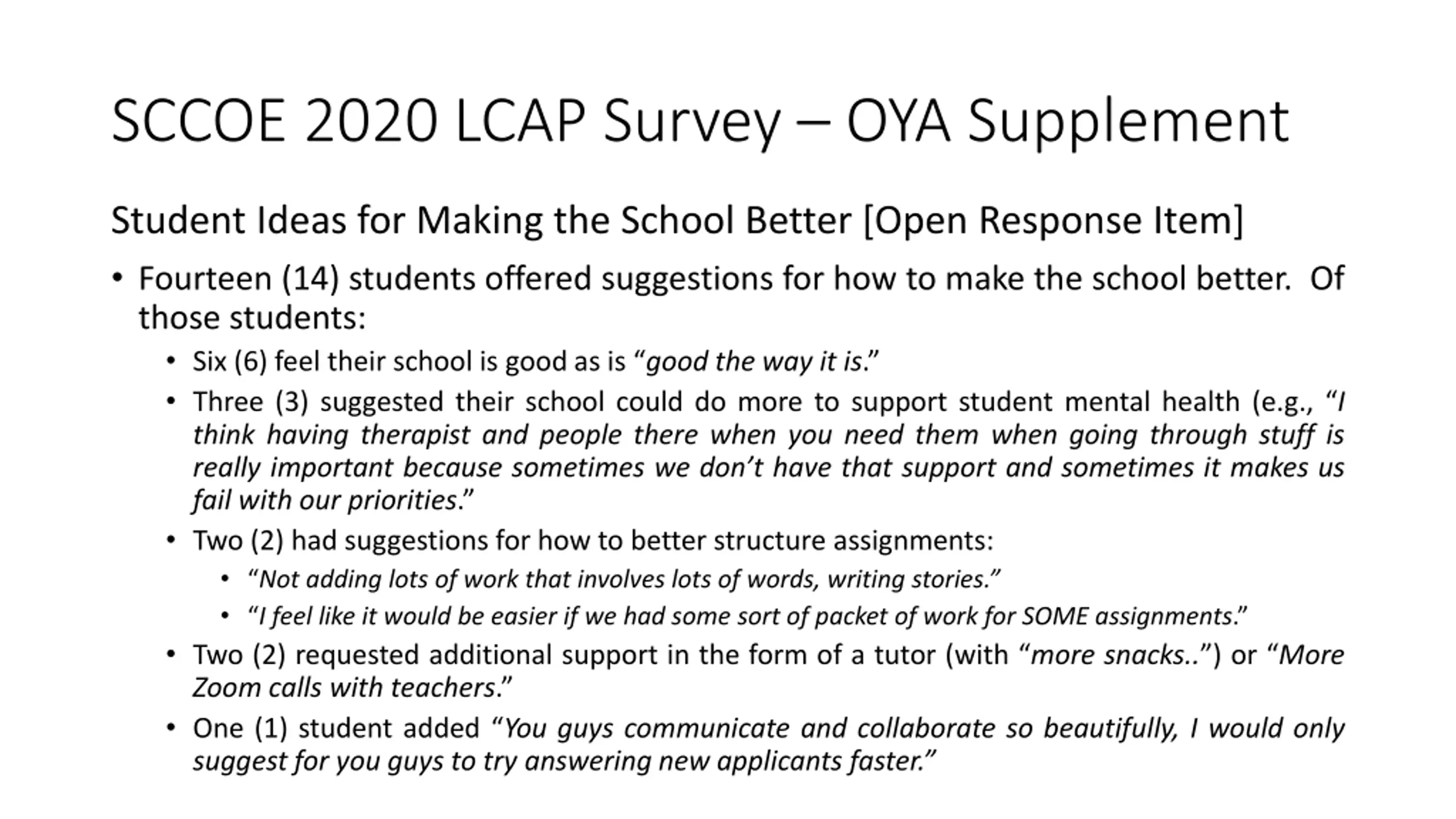 SCCOE 2020 LCAP Survey OYA Supplement Student Ideas for Making the School Better [Open Response Item] Fourteen (14) students offered suggestions for how to make the school better. Of those students: Six (6) feel their school is good as is good the way it is. Three (3) suggested their school could do more to support student mental health (e.g., I think having therapist and people there when you need them when going through stuff is really important because sometimes we don t have that support and sometimes it makes us fail with our priorities. Two (2) had suggestions for how to better structure assignments: Not adding lots of work that involves lots of words, writing stories. I feel like it would be easier if we had some sort of packet of work for SOME assignments. Two (2) requested additional support in the form of a tutor (with more snacks.. ) or More Zoom calls with teachers. One (1) student added You guys communicate and collaborate so beautifully, I would only suggest for you guys to try answering new applicants faster.